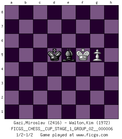 Last move : 1/2-1/2 2024 April 23 11:37:29 [Event "FICGS__CHESS__CUP_STAGE_1_GROUP_02__000006"] [Site "FICGS"] [Date "2023.11.17"] [Round "2"] [White "Gazi,Miroslav"] [Black "Walton,Kim"] [Result "1/2-1/2"] [WhiteElo "2416"] [BlackElo "1972"] 1.e4 c5 2.Nc3 Nc6 3.f4 g6 4.Nf3 Bg7 5.a4 a6 6.d3 d6 7.g3 Rb8 8.Bg2 Nf6 9.O-O O-O 10.Qe1 b5 11.e5 Ne8 12.axb5 axb5 13.Ne4 b4 14.c3 Nc7 15.Nh4 dxe5 16.f5 Nd5 17.Bg5 bxc3 18.bxc3 h6 19.fxg6 f5 20.Bd2 fxe4 21.Qxe4 Be6 22.Nf5 Bxf5 23.Rxf5 e6 24.Rf7 Nce7 25.Raf1 c4 26.Rxf8+ Bxf8 27.dxc4 Nc7 28.Bc1 Bg7 29.Qf3 Qe8 30.Ba3 Nxg6 31.Bd6 Qd7 32.c5 Rd8 33.Qg4 Ne7 34.Be4 Ne8 35.Bxe5 Nf5 36.c6 Qa7+ 37.Kh1 Qf7 38.Bg2 h5 39.Qg5 Rc8 40.Rf4 Ra8 41.Bd5 exd5 42.Rxf5 Qe6 43.c7 d4 44.cxd4 Qd5+ 45.Kg1 Ra1+ 46.Rf1 Rxf1+ 47.Kxf1 Qf7+ 48.Ke2 Nxc7 49.Bxc7 Qc4+ 50.Kf3 Qxc7 51.Qxh5 Qf7+ 52.Qxf7+ Kxf7 53.Ke4 Ke6 54.g4 Bf6 55.Kd3 Kd5 56.Ke3 Bxd4+ 57.Kf4 Be5+ 58.Kf5 Bxh2 59.g5 Be5 1/2-1/2 Follow this game move after move (download)Chess, like any creative activity, can exist only through the combined efforts of those who have creative talent, and those who have the ability to organize their creative work. (Mikhail Botvinnik) Bis jetzt ist Weiß einer wohlbekannten Analyse gefolgt. Aber jetzt begeht er einen schrecklichen Fehler: Er beginnt seinen eigenen Kopf zu benutzen. (Siegbert Tarrasch) El Ajedrez es tan inspirador que yo no creo que un buen jugador sea capaz de tener un pensamiento malo durante una partida. (Wilhelm Steinitz) L'attaque fait le spectacle, la défense gagne les matchs. (Dicton footballistique) The various flowers seem good to different people. (Chinese proverb)