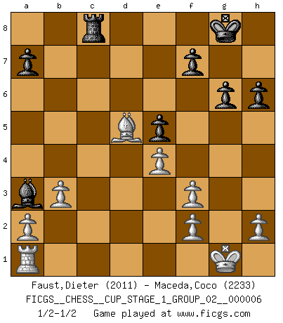 Last move : 1/2-1/2 2024 February 11 4:3:33 [Event "FICGS__CHESS__CUP_STAGE_1_GROUP_02__000006"] [Site "FICGS"] [Date "2023.11.17"] [Round "1"] [White "Faust,Dieter"] [Black "Maceda,Coco"] [Result "1/2-1/2"] [WhiteElo "2011"] [BlackElo "2233"] 1.d4 d5 2.c4 e6 3.Nf3 Nf6 4.Nc3 c6 5.Bg5 h6 6.Bxf6 Qxf6 7.e3 Nd7 8.Bd3 dxc4 9.Bxc4 g6 10.O-O Bg7 11.e4 e5 12.d5 Nb6 13.Bb3 Bg4 14.Re1 Bxf3 15.Qxf3 Qxf3 16.gxf3 O-O 17.dxc6 bxc6 18.Na4 Rfc8 19.Red1 Rc7 20.Rd6 Nxa4 21.Bxa4 Bf8 22.Rxc6 Rxc6 23.Bxc6 Rb8 24.b3 Ba3 25.Bd5 Rc8 26.Bc4 Rd8 27.Bd5 Rc8 28.Bc4 Rd8 29.Bd5 Rc8 1/2-1/2 Follow this game move after move (download)Chess is above all, a fight ! (Emanuel Lasker) Ein Gewinn durch eine ungenaue Kombination, sei sie auch noch so vorzeigbar, erfüllt mich mit Schaudern. (Wilhelm Steinitz) Observen a Garry Kasparov. Después de una derrota, invariablemente el gana la próxima partida. Prácticamente hace pedazos a su siguiente oponente. Eso es algo que tenemos que aprender a lograr. (Maurice Ashley) Celui qui prend des risques peut perdre, celui qui n'en prend pas perd toujours. (Xavier Tartacover) If you are going through hell, keep going. (Winston Churchill)