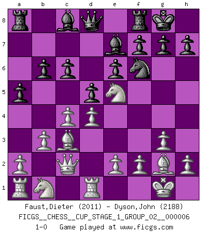 Last move : 1-0 2023 November 29 16:32:54 [Event "FICGS__CHESS__CUP_STAGE_1_GROUP_02__000006"] [Site "FICGS"] [Date "2023.11.17"] [Round "2"] [White "Faust,Dieter"] [Black "Dyson,John"] [Result "1-0"] [WhiteElo "2011"] [BlackElo "2188"] 1.d4 Nf6 2.c4 e6 3.Nf3 d5 4.g3 Bb4+ 5.Bd2 Be7 6.Bg2 O-O 7.O-O c6 8.Qc2 b6 9.Rd1 Nbd7 10.b3 a5 11.Bc3 Ne5 12.Nxe5 1-0 Follow this game move after move (download)I feel as if I were a piece in a game of Chess, when my opponent says of it: That piece cannot be moved. (Soren Kierkegaard) Viele Opfer benötigen überhaupt keine konkrete Berechnung. Es genügt sich die entstehende Position kurz vorzustellen, um uns davon zu überzeugen, dass das Opfer korrekt ist. (Mikhail Nekhemyevich Tal) Juega la Apertura como un libro, el Juego Medio como un mago y los Finales como una máquina. (Spielmann) À la honte des hommes, on sait que les lois du jeu sont les seules qui soient partout justes, claires, inviolables et exécutées. Pourquoi l'Indien qui a donné les règles du jeu d'échecs est-il obéi de bon gré dans toute la terre, et que les décrétales des papes, par exemple, sont aujourd'hui un objet d'horreur et de mépris ? C'est que l'inventeur des échecs combina tout avec justesse pour la satisfaction des joueurs, et que les papes, dans leurs décrétales, n'eurent en vue que leur seul avantage. L'Indien voulut exercer également l'esprit des hommes et leur donner du plaisir; les papes ont voulu abrutir l'esprit des hommes. Voltaire (Dictionnaire philosophique / Garnier 1967) Yoga is 99% practice and 1% knowledge. (Sri Krishna Pattabhi Jois)