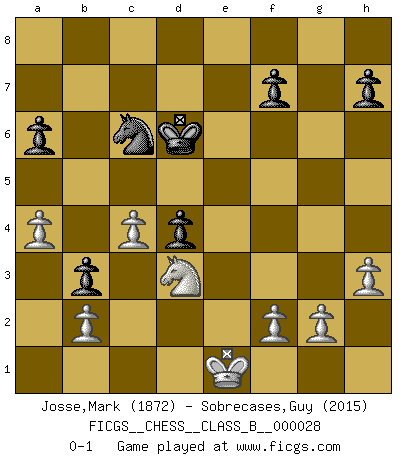 Last move : 0-1 2008 August 4 4:59:35 [Event "FICGS__CHESS__CLASS_B__000028"] [Site "FICGS"] [Date "2007.09.10"] [Round "1"] [White "Josse,Mark"] [Black "Sobrecases,Guy"] [Result "0-1"] [WhiteElo "1872"] [BlackElo "2015"] 1.e4 c5 2.Nf3 Nc6 3.d4 cxd4 4.Nxd4 Nf6 5.Nc3 e5 6.Ndb5 d6 7.Bg5 a6 8.Na3 b5 9.Nd5 Be7 10.Bxf6 Bxf6 11.c3 Ne7 12.Nxf6+ gxf6 13.Nc2 f5 14.exf5 Bxf5 15.Ne3 Be6 16.Bd3 d5 17.Qh5 e4 18.Be2 Qd6 19.Rd1 O-O-O 20.a4 b4 21.O-O Kb7 22.c4 d4 23.Qh4 Bd7 24.Nc2 Nc6 25.Qxe4 Rhe8 26.Qd3 Bf5 27.Qxf5 Rxe2 28.Rfe1 Qe7 29.Qd3 Rxe1+ 30.Nxe1 Re8 31.Kf1 Qe4 32.Qxe4 Rxe4 33.Nd3 Kc7 34.h3 Kd6 35.Re1 Rxe1+ 36.Kxe1 b3 0-1 This chess game has been lost on time (started : 2007.09.10 17:4:30) Sicilian : Pelikan (Lasker/Sveshnikov) variation Queenside Castling by player Black (move 19) Kingside Castling by player White (move 21) Player Black won this chess game. Follow this game move after move (download)Chess is the gymnasium of the mind. (Blaise Pascal) Ich bin stolz ein Bulgare zu sein. (Veselin Topalov) Una buena memoria, concentración, imaginación y una fuerte voluntad, se requiere para llegar a ser un buen jugador. (Bobby Fischer) Le système Elo représente seulement une moyenne. Il est simplement un indicateur de votre stabilité. (Anatoli Karpov) If everyone is thinking alike, then somebody isn't thinking. (US General George S. Patton)