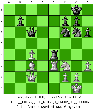 Last move : 0-1 2024 February 6 1:32:57 [Event "FICGS__CHESS__CUP_STAGE_1_GROUP_02__000006"] [Site "FICGS"] [Date "2023.11.17"] [Round "2"] [White "Dyson,John"] [Black "Walton,Kim"] [Result "0-1"] [WhiteElo "2188"] [BlackElo "1972"] 1.e4 e5 2.Nf3 Nc6 3.Bc4 Bc5 4.d3 Nf6 5.O-O d6 6.c3 a6 7.Re1 O-O 8.h3 h6 9.Nbd2 Ba7 10.a4 Re8 11.b4 Be6 12.Qc2 Bxc4 13.Nxc4 d5 14.Ne3 Bxe3 15.Bxe3 Qd7 16.exd5 Nxd5 17.Bd2 Qd6 18.b5 axb5 19.axb5 Rxa1 20.Rxa1 Nce7 21.c4 Nf6 22.Re1 Ng6 23.Re3 c6 24.bxc6 Qxc6 25.Bc3 e4 26.dxe4 Rxe4 0-1 This chess game has been lost on time (started : 2023.11.17 20:37:31) Follow this game move after move (download)In Chess, as it is played by masters, chance is practically eliminated. (Emanuel Lasker) Ich moechte nie einem Club beitreten, der Leute wie mich als Mitglieder aufnimmt. (Woody Allen) Cuando veas una buena jugada, trata de encontrar otra mejor. (Emanuel Lasker) Vous savez, camarade Pachman, je n'éprouve pas de plaisir à être ministre, je jouerais plutôt aux échecs comme vous, ou alors ferais une révolution au Venezuela. (Che Guevara à Ludek Pachman, 'Checkmate in Prague', 1975) You can think I'm wrong, but that's no reason to quit thinking. (Gregory House, House M.D.)
