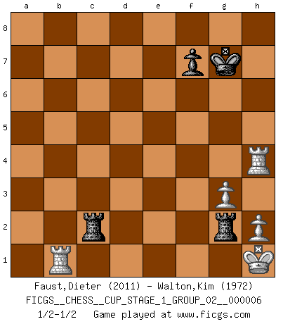 Last move : 1/2-1/2 2024 January 24 9:22:14 [Event "FICGS__CHESS__CUP_STAGE_1_GROUP_02__000006"] [Site "FICGS"] [Date "2023.11.17"] [Round "1"] [White "Faust,Dieter"] [Black "Walton,Kim"] [Result "1/2-1/2"] [WhiteElo "2011"] [BlackElo "1972"] 1.e4 e5 2.Nf3 Nc6 3.Bb5 a6 4.Ba4 Nf6 5.O-O Bc5 6.c3 O-O 7.d4 Ba7 8.Bg5 exd4 9.e5 h6 10.Bxf6 gxf6 11.Qd2 Kg7 12.cxd4 fxe5 13.dxe5 d6 14.Bxc6 bxc6 15.Rd1 Bg4 16.Qf4 Bxf3 17.Qxf3 Re8 18.exd6 cxd6 19.Qxc6 Re2 20.Nc3 Rxb2 21.Rxd6 Qe8 22.Qf3 Rxf2 23.Qg3+ Kf8 24.Kh1 Qe3 25.Rxa6 Re8 26.Qxe3 Bxe3 27.Rd1 Bd4 28.Nb5 Bc5 29.Rxh6 R8e2 30.g3 Rxa2 31.Nc3 Rac2 32.Ne4 Rfe2 33.Nxc5 Rxc5 34.Rf1 R5c2 35.Ra1 Kg7 36.Rh4 Rf2 37.Rb1 Rg2 38.Ra1 Rgf2 39.Rb1 Rg2 1/2-1/2 Follow this game move after move (download)Without error there can be no brilliancy. (Emanuel Lasker) Fischer: 'Remis!?' Uhlmann: 'Aber es muss doch dreimal Zugwiederholung sein!' Fischer: 'Sie nehmen das Remis an, wie ich es sage, sonst spiele ich weiter und werde Sie dann schlagen!' (Robert James Fischer) Jugadores de primera clase pierden en contra de jugadores de segunda clase porque los jugadores de segunda clase a veces juegan una partida de primer clase. (Siegbert Tarrasch) Mais l'homme est une créature légère et illogique : semblable au joueur d'échecs, il n'aime que le processus du but à atteindre, non le but lui-même. (Dostoïevsky) Luck is the residue of design. (John Milton)