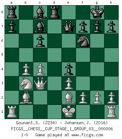 Last move : 1-0 2024 January 7 0:36:39 [Event "FICGS__CHESS__CUP_STAGE_1_GROUP_03__000006"] [Site "FICGS"] [Date "2023.11.17"] [Round "2"] [White "Gounant,Stanislas"] [Black "Johansen,Jorgen"] [Result "1-0"] [WhiteElo "2234"] [BlackElo "2016"] 1.b3 e5 2.Bb2 Nc6 3.e3 Nf6 4.Nf3 e4 5.Nd4 Bc5 6.d3 d5 7.Nxc6 bxc6 8.Nd2 O-O 9.dxe4 dxe4 10.a3 Qe7 11.b4 Bb6 12.Be2 Rd8 13.c4 c5 14.Qc1 c6 15.Qc3 cxb4 16.axb4 Bc7 17.Nb3 1-0 This chess game has been lost on time (started : 2023.11.17 20:37:33) Follow this game move after move (download)When you play Bobby, it is not a question if you win or lose. It is a question if you survive. (Boris Spassky) Capablanka war das größte Genie der Schachgeschichte! Aber denken sie nicht er habe nichts vom Schach verstanden. Er wusste nur soviel wie er wissen musste um seine Ziele zu erreichen. (Mikhail Moiseyevich Botvinik) Tu cuerpo tiene que estar en óptima condición. Tu Ajedrez se deteriora como lo hace tu cuerpo. No puedes separar la mente y el cuerpo. (Bobby Fischer) L'ordinateur a tué l'originalité. Il n'y a plus guère d'aventures sur l'échiquier. (Jacob Murray) When you stop learning you start dying. (Scott Adams)