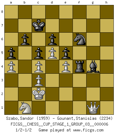 Last move : 1/2-1/2 2023 December 27 20:42:28 [Event "FICGS__CHESS__CUP_STAGE_1_GROUP_03__000006"] [Site "FICGS"] [Date "2023.11.17"] [Round "2"] [White "Szabo,Sandor"] [Black "Gounant,Stanislas"] [Result "1/2-1/2"] [WhiteElo "1959"] [BlackElo "2234"] 1.d4 e6 2.c4 b6 3.Nc3 Bb4 4.e4 Bb7 5.f3 Bxc3+ 6.bxc3 Qh4+ 7.g3 Qe7 8.Bd3 d6 9.Ne2 Nd7 10.O-O e5 11.Qa4 h5 12.h4 c5 13.Be3 Nh6 14.Kf2 f6 15.d5 g5 16.Rh1 Nf7 17.Rab1 Kd8 18.Qc2 Kc7 19.a4 a5 20.Nc1 Rag8 21.Nb3 g4 22.fxg4 Rxg4 23.Be2 R4g8 24.Nd2 Nh6 25.Bxh5 Ng4+ 26.Bxg4 Rxg4 27.Qd1 Qg7 28.Qf3 Rf8 29.Kg2 f5 30.Bg5 Rxg5 31.hxg5 Qxg5 32.Rbd1 f4 33.Rh7 Bc8 34.Rdh1 Kb8 35.R1h5 Qg6 36.R5h6 Qg8 37.Rh4 Nf6 38.Rh8 Qxh8 39.Rxh8 Rxh8 40.gxf4 Rh3 41.Qf1 Rh4 42.Qb1 Rg4+ 43.Kf2 Rxf4+ 44.Ke2 Bg4+ 45.Kd3 Kb7 46.Kc2 Rf2 47.Qg1 Rf4 48.Qh2 Nh5 49.Nb1 Nf6 50.Qg1 Kc7 1/2-1/2 Follow this game move after move (download)If one piece is badly posted, the whole game is bad. (Tarrasch) Vielleicht wirkt die Aura früherer Spieler glanzvoller als die der heutigen Spieler, aber das liegt daran, dass man kein Programm wie Fritz hatte, das einem all die Löcher in ihren Partien zeigt. (Vladimir Kramnik) El Ajedrez es despiadado: debes de estar preparado para matar gente. (Nigel Short) 'L'échange des dames est un coup dur pour les deux adversaires...' Un journaliste lors d'une partie du match Spassky-Fischer It's only after you lost everything, Tyler says, that you're free to do anything. (Chuck Palahniuk, Fight Club)