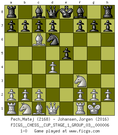 Last move : 1-0 2024 January 20 20:52:38 [Event "FICGS__CHESS__CUP_STAGE_1_GROUP_03__000006"] [Site "FICGS"] [Date "2023.11.17"] [Round "1"] [White "Pech,Matej"] [Black "Johansen,Jorgen"] [Result "1-0"] [WhiteElo "2168"] [BlackElo "2016"] 1.e4 e5 2.Nf3 Nc6 3.Bb5 Nf6 4.O-O Nxe4 5.d4 Nd6 6.Bxc6 1-0 This chess game has been lost on time (started : 2023.11.17 20:37:33) Follow this game move after move (download)All my games are real. (Bobby Fischer) Computer sind die einzigen Gegner, die nicht immer eine Ausrede auf Lager haben, wenn sie gegen mich verlieren. (Robert James Fischer) Fischer es el jugador mas fuerte del mundo. De hecho, el jugador mas fuerte que jamas haya existido. (Larry Evans) Les échecs, c'est l'art d'analyser. (Mikhail Botvinnik) Work expands to fill the time available. (C. Northcote Parkinson, in Parkinson's Laws)