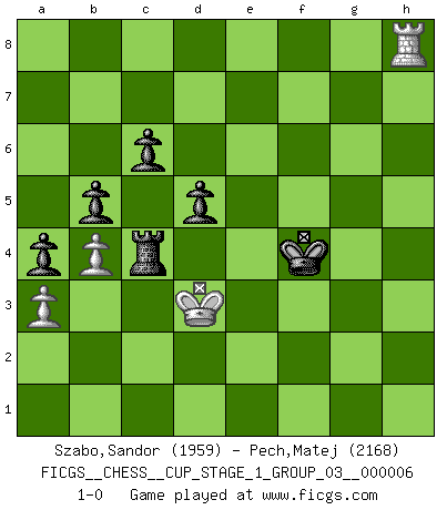 Last move : 1-0 2024 July 2 3:30:42 [Event "FICGS__CHESS__CUP_STAGE_1_GROUP_03__000006"] [Site "FICGS"] [Date "2023.11.17"] [Round "1"] [White "Szabo,Sandor"] [Black "Pech,Matej"] [Result "1-0"] [WhiteElo "1959"] [BlackElo "2168"] 1.d4 Nf6 2.Nc3 d5 3.Bf4 Bf5 4.Nb5 Na6 5.e3 e6 6.a3 Be7 7.Nf3 Ne4 8.Nd2 Nxd2 9.Qxd2 c6 10.Nc3 Nb8 11.Bd3 Bg6 12.O-O O-O 13.Ne2 Nd7 14.Rfc1 a5 15.c4 a4 16.cxd5 exd5 17.Nc3 Bxd3 18.Qxd3 g5 19.Bg3 f5 20.Be5 Qe8 21.Bc7 Qh5 22.Ne2 Qg6 23.h3 Rac8 24.Bh2 Rce8 25.b4 f4 26.Qxg6+ hxg6 27.exf4 Nb6 28.Ra2 Nc4 29.Bg3 gxf4 30.Bxf4 Bd8 31.Bg3 Bf6 32.Rd1 b5 33.Rd3 g5 34.f4 Kh7 35.fxg5 Bxg5 36.Bf2 Rf6 37.Ng3 Kg6 38.Nf1 Bc1 39.Nh2 Re4 40.Nf3 Bb2 41.Kf1 Rf8 42.Ne5+ Kh7 43.Nf3 Kh6 44.Bg1 Kh7 45.Bf2 Kg8 46.Bg1 Rfe8 47.Ne5 Rf8+ 48.Nf3 Rf6 49.Bf2 Rf5 50.Nd2 Ref4 51.Nf3 Re4 52.Bg1 Rf7 53.Bf2 Rf6 54.h4 Kg7 55.g3 Kh6 56.Kg2 Rf8 57.Bg1 Re2+ 58.Kh3 Kg7 59.Kg4 Rfe8 60.Kh3 Kg8 61.h5 Bc1 62.Ra1 Rc2 63.Ne5 Nxe5 64.dxe5 Rxe5 65.Bd4 Rxh5+ 66.Kg4 Rg5+ 67.Kf3 Rg6 68.Rc3 Rxc3+ 69.Bxc3 Bg5 70.Be5 Bf6 71.Bxf6 Rxf6+ 72.Ke2 Kh7 73.Ke3 Kg7 74.Rg1 Re6+ 75.Kd3 Kf6 76.Rf1+ Kg5 77.Kd4 Re4+ 78.Kd3 Kg4 79.Rf6 Rc4 80.Rg6+ Kf5 81.Rh6 Rg4 82.Rh3 Kg5 83.Ke2 Rc4 84.Kd3 Kg4 85.Rh6 Kxg3 86.Rh7 Kf4 87.Rh8 1-0 This chess game has been lost on time (started : 2023.11.17 20:37:33) Follow this game move after move (download)In Chess, at least, the brave inherit the earth. (Edmar Mednis) Je älter ich werde, um so mehr schätze ich die Bauern. (Paul Keres) Cuando la partida de Ajedrez termina, el Peón y el Rey regresan a la misma caja. (Irish saying) Les Echecs, c'est l'art de la guerre sans les charniers, c'est la résurrection des morts tombés au champ d'honneur, l'espoir perpétuel, la suprématie de l'intelligence sur la force, la culture de l'esprit. (F. Szpiner) Life is like internet, nothing interesting, but noone want to leave it. (Ilmars Cirulis)