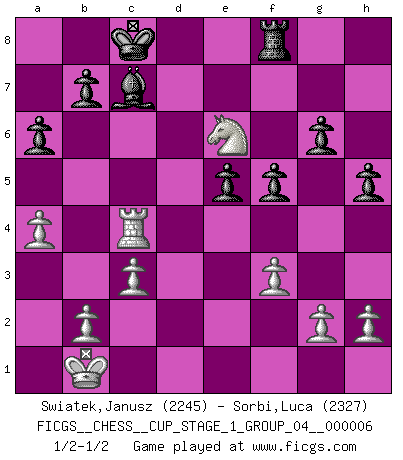 Last move : 1/2-1/2 2024 February 9 12:38:22 [Event "FICGS__CHESS__CUP_STAGE_1_GROUP_04__000006"] [Site "FICGS"] [Date "2023.11.17"] [Round "2"] [White "Swiatek,Janusz"] [Black "Sorbi,Luca"] [Result "1/2-1/2"] [WhiteElo "2245"] [BlackElo "2327"] 1.e4 c5 2.Nf3 d6 3.d4 cxd4 4.Nxd4 Nf6 5.Nc3 a6 6.f3 e5 7.Nb3 Be6 8.Be3 h5 9.Nd5 Bxd5 10.exd5 g6 11.Qd2 Nbd7 12.O-O-O Nb6 13.Kb1 Nfxd5 14.Bf2 Nf6 15.Bh4 Be7 16.Bxf6 Bxf6 17.Qxd6 Qxd6 18.Rxd6 Bd8 19.Rd3 Nd7 20.a4 Bc7 21.Rc3 O-O-O 22.Bc4 Rhf8 23.Rd1 Nb6 24.Rxd8+ Kxd8 25.Nc5 Nxc4 26.Rxc4 Kc8 27.c3 f5 28.Ne6 1/2-1/2 Follow this game move after move (download)I look one move ahead... the best ! (Siegbert Tarrasch) Das Spiel gibt uns die Genugtuung, die das Leben uns versagt. (Emanuel Lasker) Te sientas frente a un tablero y repentinamente tu corazón brinca. Tu mano tiembla al tomar una pieza y moverla. Pero lo que el Ajedrez te enseña es que tu debes permanecer ahí con calma y pensar de que si realmente es una buena idea o de que si hay otras ideas mejores. (Stanley Kubrick) Aucun coup ne doit être joué sans but. (Pedro Damiano) A proverb is a short sentence based on long experience. (Miguel de Cervantes)