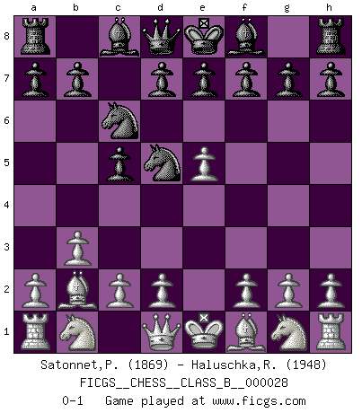 Last move : 0-1 2007 November 21 7:29:30 [Event "FICGS__CHESS__CLASS_B__000028"] [Site "FICGS"] [Date "2007.09.10"] [Round "1"] [White "Satonnet,Patrick"] [Black "Haluschka,Rainer"] [Result "0-1"] [WhiteElo "1869"] [BlackElo "1948"] 1.e4 c5 2.b3 Nc6 3.Bb2 Nf6 4.e5 Nd5 0-1 This chess game has been lost on time (started : 2007.09.10 17:4:30) Sicilian defense Player Black won this chess game. Follow this game move after move (download)A great player and a great example for many. His book My 60 Memorable Games had a big impact on me. It is a shame he didn't continue to enrich the world of chess with his unparalleled understanding after 1972. (Jan Timman, about Bobby Fischer's death) Ja, ich habe einmal eine Blitzpartie gespielt, es war in einem Zug, 1929. --im Interview 1989 (Mikhail Moiseyevich Botvinik) Si el Ajedrez es una ciencia, es la mas inexacta. Si el Ajedrez es un arte, es demasiado inexacto para ser visto como tal. Si el Ajedrez es un deporte, es demasiado esotérico. Si el Ajedrez es un juego, es demasiado exigente para ser solo un juego. Si el Ajedrez es una aventura, es una muy demandante. Si el Ajedrez es una pasión, es una muy gratificante. Si el Ajedrez es la vida, es una muy triste. (Anónimo) On entre au jeu d'Echecs comme on entre en Religion. Pour le joueur d'Echecs, la partie d'Echecs c'est l'office, la messe, le défilé du 1er Mai, le dépôt de gerbe au Monument aux Morts. C'est un drame sacré. (Michel Roos) If we knew what we were doing, we would not call it research. (Albert Einstein)
