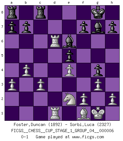 Last move : 0-1 2024 February 18 14:44:56 [Event "FICGS__CHESS__CUP_STAGE_1_GROUP_04__000006"] [Site "FICGS"] [Date "2023.11.17"] [Round "1"] [White "Foster,Duncan"] [Black "Sorbi,Luca"] [Result "0-1"] [WhiteElo "1892"] [BlackElo "2327"] 1.e4 c5 2.a3 g6 3.b4 Bg7 4.Nc3 d6 5.g3 Nc6 6.Rb1 e5 7.Bg2 Nge7 8.d3 Nd4 9.Nce2 O-O 10.c3 Nxe2 11.Nxe2 c4 12.O-O cxd3 13.Qxd3 Be6 14.Rd1 Nc8 15.Be3 Nb6 16.Bxb6 Qxb6 17.Qxd6 Qxd6 18.Rxd6 Rfc8 19.Rbd1 g5 20.Bf1 g4 0-1 This chess game has been lost on time (started : 2023.11.17 20:37:35) Follow this game move after move (download)Capture of the adverse King is the ultimate but not the first object of the game. (William Steinitz) Taktik ist was man tun muß, wenn etwas zu tun ist. Strategie ist was man tun muß, wenn nichts zu tun ist. (Savielly Grigorievitsch Tartakower) ¿Cual es el objetivo de jugar una apertura de gambito?... Para adquirir una reputación de ser un jugador apuesto a costo de perder el juego. (Siegbert Tarrasch) Il a essayé de se convaincre qu'il pourrait empêcher toutes les erreurs et ne jamais perdre. L'horreur ! Gary Kasparov au sujet de Robert Fischer. Wikichess, chess moves explained by 'experimented' players. (Thibault de Vassal)