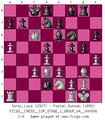 Last move : 1-0 2024 February 13 12:6:4 [Event "FICGS__CHESS__CUP_STAGE_1_GROUP_04__000006"] [Site "FICGS"] [Date "2023.11.17"] [Round "2"] [White "Sorbi,Luca"] [Black "Foster,Duncan"] [Result "1-0"] [WhiteElo "2327"] [BlackElo "1892"] 1.d4 f5 2.Bg5 h6 3.Bh4 g5 4.e3 Nf6 5.Bg3 d6 6.h4 Rg8 7.Be2 c6 8.Nd2 Be6 9.Bd3 Nbd7 10.Ne2 Qb6 11.a4 O-O-O 12.a5 Qxb2 13.O-O d5 14.Rb1 Qa3 15.Ra1 Qb4 16.c3 Qb2 17.Qa4 Qxd2 18.Qxc6+ 1-0 Follow this game move after move (download)A big shock; the best chess player in history has passed away. (Lajos Portisch, about Bobby Fischer's death) Ich bin der einzige Schachspieler, der sich während der Vorbereitungen zum Turnier verletzt hat. (Woody Allen) Cuando veas una buena jugada, trata de encontrar otra mejor. (Emanuel Lasker) Karpov est une pièce de musée. (Garry Kasparov) There's no money in correspondence chess. (John Knudsen)