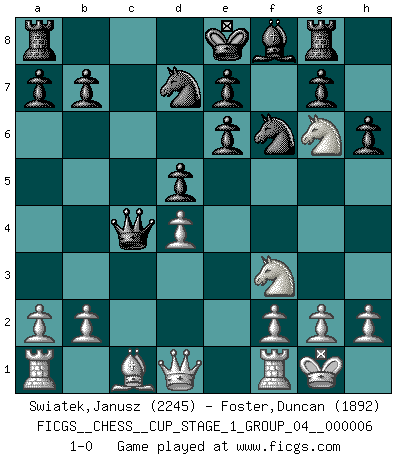 Last move : 1-0 2024 January 28 15:28:50 [Event "FICGS__CHESS__CUP_STAGE_1_GROUP_04__000006"] [Site "FICGS"] [Date "2023.11.17"] [Round "1"] [White "Swiatek,Janusz"] [Black "Foster,Duncan"] [Result "1-0"] [WhiteElo "2245"] [BlackElo "1892"] 1.e4 c6 2.d4 d5 3.e5 Bf5 4.Nf3 h6 5.Nh4 Bh7 6.e6 Nf6 7.Bd3 Bxd3 8.Qxd3 fxe6 9.Ng6 Rg8 10.O-O c5 11.c3 cxd4 12.cxd4 Qc7 13.Nd2 Nbd7 14.Nf3 Qc4 15.Qd1 1-0 This chess game has been lost on time (started : 2023.11.17 20:37:35) Follow this game move after move (download)I still hope to kill Fischer. (Boris Spassky) Ich kenne keine einzige Person, die behaupten würde, Garri Kasparow sei ein guter Mensch (Nigel Short) La captura del Rey enemigo es la finalidad pero no el primer objetivo de la partida. (William Steinitz) Dans le domaine de la peinture, de la gravure et de la sculpture, dès la première décennie de notre siècle, les artistes abandonnent la représentation de la partie d'échecs pour se concentrer sur les pièces, sur les échiquiers et sur toutes les variations auxquelles les unes et les autres peuvent donner lieu. On passe en quelque sorte d'un thème social à un thème musical (au sens de la musica médiévale, c'est-à-dire d'une notion qui inclue le rythme, l'harmonie, la construction et la déconstruction, etc.). Graphiquement et picturalement, l'échiquier apparaît comme une structure ouverte, dynamique, d'une richesse infinie, autorisant toutes les combinatoires et débouchant sur des mouvements et des rythmes de nature exponentielle. (Michel Pastoureau) The absolute truth is the thing that makes people laugh. (Carl Reiner)