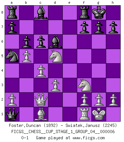 Last move : 0-1 2024 January 30 12:58:55 [Event "FICGS__CHESS__CUP_STAGE_1_GROUP_04__000006"] [Site "FICGS"] [Date "2023.11.17"] [Round "2"] [White "Foster,Duncan"] [Black "Swiatek,Janusz"] [Result "0-1"] [WhiteElo "1892"] [BlackElo "2245"] 1.e4 e5 2.Nf3 Nc6 3.Bc4 Bc5 4.c3 Nf6 5.d3 O-O 6.b4 Be7 7.O-O d5 8.exd5 Nxd5 9.b5 Na5 10.Bxd5 Qxd5 11.c4 Qd7 12.Nc3 b6 13.Nxe5 Qd4 14.Nd5 Bd6 15.Nf3 Qxa1 16.Qc2 c6 0-1 This chess game has been lost on time (started : 2023.11.17 20:37:35) Follow this game move after move (download)Chess is in its essence a game, in its form an art, and in its execution a science. (Baron Tassilo) Ein Schachspiel besteht aus drei Phasen: Die erste, wenn du hofftst den Vorteil zu haben, die zweite, wenn du glaubst einen Vorteil zu haben, und die dritte.... wenn du weißt Du wirst verlieren. (Savielly Grigorievitsch Tartakower) a manera como él juega al Ajedrez, demuestra la completa naturaleza de un hombre. (Stanley Ellin) Je fais ceci parce que dans cinquante coups j'obtiendrai cela; je m'appelle Mikhail Moisevitch Botvinnik. (Botvinnik) A government big enough to give you everything you want is strong enough to take everything you have. (Thomas Jefferson)