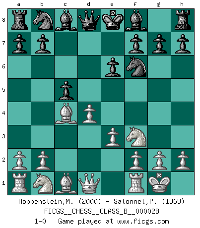 Last move : 1-0 2007 October 21 7:39:41 [Event "FICGS__CHESS__CLASS_B__000028"] [Site "FICGS"] [Date "2007.09.10"] [Round "1"] [White "Hoppenstein,Michael"] [Black "Satonnet,Patrick"] [Result "1-0"] [WhiteElo "2000"] [BlackElo "1869"] 1.d4 d5 2.c4 dxc4 3.e3 Nf6 4.Bxc4 e6 5.Nf3 c5 6.O-O 1-0 This chess game has been lost on time (started : 2007.09.10 17:4:30) Queen's gambit accepted Kingside Castling by player White (move 6) Player White won this chess game. Follow this game move after move (download)There is no remorse like the remorse of Chess. (H. G. Wells) Mein Name ist Rustam Kamsky. Sie haben meinen Sohn belästigt. Bereiten Sie sich aufs Sterben vor. (Rustam Kamsky) A la fecha, Fischer esta simplemente un nivel arriba de todos los mejores jugadores de Ajedrez del mundo. (John Jacobs) À la honte des hommes, on sait que les lois du jeu sont les seules qui soient partout justes, claires, inviolables et exécutées. Pourquoi l'Indien qui a donné les règles du jeu d'échecs est-il obéi de bon gré dans toute la terre, et que les décrétales des papes, par exemple, sont aujourd'hui un objet d'horreur et de mépris ? C'est que l'inventeur des échecs combina tout avec justesse pour la satisfaction des joueurs, et que les papes, dans leurs décrétales, n'eurent en vue que leur seul avantage. L'Indien voulut exercer également l'esprit des hommes et leur donner du plaisir; les papes ont voulu abrutir l'esprit des hommes. Voltaire (Dictionnaire philosophique / Garnier 1967) If only people were all showed a certain minimum level of niceness; if only people didn't retract verbal draw offers (without draw box ticked) on ficgs; if only people didn't kill; if only people didn't run concentration / extermination camps, if only people didn't drop nuclear bombs on Hiroshima and Nagasaki, and so on - it would be a much more beautiful world. But sadly, things are not so... (Normajean Yates)