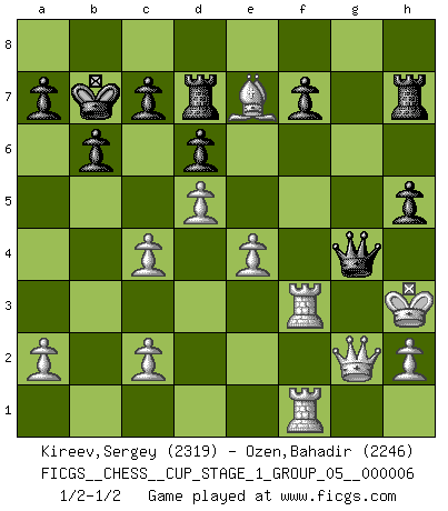Last move : 1/2-1/2 2023 December 5 13:5:59 [Event "FICGS__CHESS__CUP_STAGE_1_GROUP_05__000006"] [Site "FICGS"] [Date "2023.11.17"] [Round "1"] [White "Kireev,Sergey"] [Black "Ozen,Bahadir"] [Result "1/2-1/2"] [WhiteElo "2319"] [BlackElo "2246"] 1.e4 e5 2.f4 exf4 3.Nf3 g5 4.Nc3 Nc6 5.g3 d6 6.d4 Bg7 7.d5 Ne5 8.gxf4 gxf4 9.Bxf4 Bg4 10.Be2 Nxf3+ 11.Bxf3 Qf6 12.O-O Bh3 13.Bg2 Bxg2 14.Kxg2 Qg6+ 15.Kh3 Bxc3 16.bxc3 O-O-O 17.Qg4+ Rd7 18.Bg5 Ne7 19.Rf6 Qg8 20.Raf1 h5 21.Qg2 Rh7 22.R6f3 b6 23.c4 Kb7 24.Bxe7 Qg4+ 1/2-1/2 Follow this game move after move (download)Excellence at Chess is one mark of a scheming mind. (Sir Arthur Conan Doyle) Unter Putin wird alles Geld aus Russland wie von einem Staubsauger nach Moskau umgeleitet, das ist wie ein schwarzes Loch. (Garry Kasparov) El Peón aislado arroja penumbra sobre todo el tablero. (Aaron Nimzovich) La vie est comme un jeu d'échecs : nous esquissons un plan, mais celui-ci est tributaire de ce que daignent faire l'adversaire aux échecs et le destin dans la vie. (Arthur Schopenhauer) First of all, we have to go back to the classical time control. (Anatoly Karpov)
