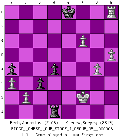 Last move : 1-0 2024 February 27 16:46:44 [Event "FICGS__CHESS__CUP_STAGE_1_GROUP_05__000006"] [Site "FICGS"] [Date "2023.11.17"] [Round "1"] [White "Pech,Jaroslav"] [Black "Kireev,Sergey"] [Result "1-0"] [WhiteElo "2106"] [BlackElo "2319"] 1.e4 g6 2.d4 Bg7 3.Nc3 e6 4.h4 h6 5.h5 g5 6.f4 d6 7.Nf3 g4 8.Nh4 Bf6 9.g3 Nc6 10.Be3 d5 11.e5 Bxh4 12.Rxh4 f5 13.exf6 Nxf6 14.Bd3 Ne7 15.Rxg4 Nf5 16.Bd2 Nxg4 17.Qxg4 Qf6 18.Bxf5 Qxf5 19.Qxf5 exf5 20.Nxd5 Kd8 21.Kf2 Bd7 22.c4 a5 23.Ne3 b6 24.Bc3 Kc8 25.Nd5 Rf8 26.Re1 Kd8 27.Ne7 b5 28.d5 bxc4 29.Nc6+ Kc8 30.Re7 Ra6 31.Be5 Re8 32.Rf7 Bxc6 33.dxc6 Rxc6 34.Rxf5 a4 35.a3 Rd8 36.g4 Rd2+ 37.Ke3 Rh2 38.Rf7 Kd8 39.Rg7 Ke8 40.f5 Rh1 41.Bc3 Rd1 42.Rg6 Rcd6 43.f6 c5 44.Rxh6 R6d4 45.Bxd4 cxd4+ 46.Kf2 c3 47.Rh8+ 1-0 Follow this game move after move (download)Suddenly it was obvious to me in my analysis I had missed what Fischer had found with the greatest of ease at the board. (Mikhail Botvinnik) Die größte Kunst beim Schach besteht darin dem Gegner nicht zu zeigen was er tun kann. (Garry Kasparov) No hay un Gran Maestro de Ajedrez que sea normal; solo se diferencían ellos por la magnitud de su locura. (Viktor Korchnoi) Le jeu d'échecs est comme rejeté hors du temps. (Antoine de Saint-Exupéry) O divine art of subtlety and secrecy! Through you we learn to be invisible, through you inaudible and hence we can hold the enemy's fate in our hands. (Sun Tzu)
