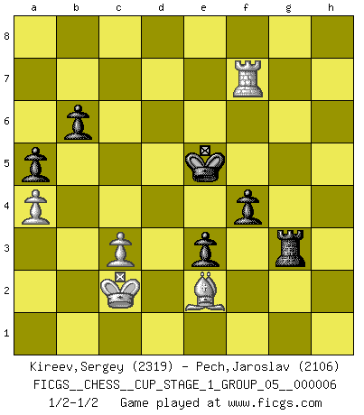Last move : 1/2-1/2 2024 February 27 23:57:50 [Event "FICGS__CHESS__CUP_STAGE_1_GROUP_05__000006"] [Site "FICGS"] [Date "2023.11.17"] [Round "2"] [White "Kireev,Sergey"] [Black "Pech,Jaroslav"] [Result "1/2-1/2"] [WhiteElo "2319"] [BlackElo "2106"] 1.Nf3 Nf6 2.c4 c5 3.Nc3 Nc6 4.g3 d5 5.d4 e6 6.cxd5 exd5 7.Bg2 Be7 8.dxc5 Bxc5 9.O-O O-O 10.Na4 Be7 11.Be3 Bg4 12.h3 Bxf3 13.Bxf3 Qd7 14.h4 Rfd8 15.Rc1 d4 16.Bf4 Nd5 17.Bg5 b6 18.Rxc6 Bxg5 19.Rc2 Bf6 20.Rd2 Qc7 21.e4 Ne3 22.fxe3 dxe3 23.Qc2 Qxg3+ 24.Rg2 Qxh4 25.Rh2 Qg3+ 26.Rg2 Qh4 27.Rh2 Qg3+ 28.Qg2 Qxg2+ 29.Rxg2 Bd4 30.Rb1 Rac8 31.Kf1 g6 32.Rd1 Kg7 33.Nc3 Bxc3 34.Rxd8 Rxd8 35.bxc3 Kf6 36.Ke2 Rc8 37.Kd3 Ke5 38.Be2 f5 39.exf5 gxf5 40.Rg7 f4 41.Re7+ Kf5 42.Rf7+ Ke5 43.Kc2 Rg8 44.Rxh7 a5 45.a4 Rg3 46.Rf7 1/2-1/2 Follow this game move after move (download)A strong memory, concentration, imagination, and a strong will is required to become a great Chess player. (Bobby Fischer) Ja, jede Frau in Holland liebt mich bestimmt, und alle Männer hassen mich. (Loek van Wely) Puntos débiles o agujeros en la posición de tu oponente deben de ser ocupados por piezas, no Peones. (Siegbert Tarrasch) Mais n'est-ce pas déjà le limiter injurieusement que d'appeler les échecs un jeu? N'est-ce pas aussi une science, un art, ou quelque chose qui, comme le cercueil de Mahomet entre ciel et terre, est suspendu entre l'un et l'autre, et qui réunit un nombre incroyable de contraires ? (Stefan Zweig) I have opinions of my own - strong opinions - but I don't always agree with them. (George Bush)