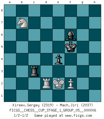 Last move : 1/2-1/2 2024 February 28 16:57:13 [Event "FICGS__CHESS__CUP_STAGE_1_GROUP_05__000006"] [Site "FICGS"] [Date "2023.11.17"] [Round "1"] [White "Kireev,Sergey"] [Black "Mach,Jiri"] [Result "1/2-1/2"] [WhiteElo "2319"] [BlackElo "2037"] 1.e4 e6 2.d4 d5 3.Nc3 Nf6 4.Bg5 dxe4 5.Nxe4 Be7 6.Bxf6 gxf6 7.Nf3 f5 8.Nc3 a6 9.a4 Nc6 10.Qd2 Nb4 11.Bc4 Qd6 12.Bb3 c5 13.d5 exd5 14.Nxd5 Nxd5 15.Qxd5 Be6 16.Qxd6 Bxd6 17.Bxe6 fxe6 18.g3 Ke7 19.Ke2 Rhg8 20.a5 h5 21.h3 Rac8 22.Ra4 c4 23.Rd1 Rc5 24.Rd4 Rb5 25.Ra2 Rc5 26.Rh4 Rh8 27.c3 Bc7 28.Kf1 Bxa5 29.Ra4 Rb5 30.Rhxc4 e5 31.g4 hxg4 32.hxg4 Kf6 33.gxf5 Kxf5 34.b4 Bd8 35.Ke2 Rd5 36.Ra2 e4 37.Nd4+ Ke5 38.Rc8 Rh3 39.Rc2 Be7 40.Rd2 a5 41.bxa5 Rxa5 42.Rc7 Bf6 43.Rc8 Kf4 44.Ne6+ Kf5 45.Rc5+ Rxc5 46.Nxc5 Rxc3 47.Nxb7 1/2-1/2 Follow this game move after move (download)Whoever sees no other aim in the game than that of giving checkmate to one's opponent will never become a good Chess player. (Euwe) Darum geht es im Schach. Einen Tag gibst du deinem Gegner eine Lektion, am nächsten Tag gibt er dir eine. (Robert James Fischer) Creo que una cierta cantidad de temperamento es esperada de los genios del Ajedrez. (Ron Gross) Vous m'avez demandé de vous exposer quel est le fondement de la prière. Je ne fais que préparer les pièces du jeu sur la table... Nous sera-t-il permis d'en adopter les règles et si nous les appliquons scrupuleusement nous ne tarderons pas à faire mat le Roi divin ! Il ne pourra échapper à nos mains. (Sainte Thérèse d'Avila, Chemin de perfection) Think like a man of action, act like a man of thought. (Henri Louis Bergson)
