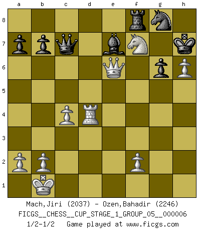 Last move : 1/2-1/2 2024 February 19 23:56:52 [Event "FICGS__CHESS__CUP_STAGE_1_GROUP_05__000006"] [Site "FICGS"] [Date "2023.11.17"] [Round "1"] [White "Mach,Jiri"] [Black "Ozen,Bahadir"] [Result "1/2-1/2"] [WhiteElo "2037"] [BlackElo "2246"] 1.e4 c6 2.d4 d5 3.Nc3 dxe4 4.Nxe4 Bf5 5.Ng3 Bg6 6.h4 h6 7.Nf3 Nd7 8.h5 Bh7 9.Bd3 Bxd3 10.Qxd3 e6 11.Bf4 Qa5+ 12.Bd2 Bb4 13.c3 Be7 14.c4 Qc7 15.O-O-O Ngf6 16.Kb1 O-O 17.Ne4 Rad8 18.Nxf6+ Nxf6 19.Qe2 c5 20.g4 cxd4 21.g5 hxg5 22.h6 g6 23.Bxg5 Kh7 24.Rh4 Ng8 25.Rhxd4 Rxd4 26.Rxd4 f6 27.Qxe6 fxg5 28.Nxg5+ Kh8 29.Nf7+ Kh7 1/2-1/2 Follow this game move after move (download)The enormous mental resilience, without which no Chess player can exist, was so much taken up by Chess that he could never free his mind of this game. (Albert Einstein) Man kann eine Schachpartie nur gewinnen, wenn das Gleichgewicht gestört ist. In einer Stellung mit ungestörtem Gleichgewicht ist auch das größte Genie hilflos - in der Stellung steckt dann eben kein genialer Einfall. (Wilhelm Steinitz) La batalla por la última verdad nunca sera ganada. Y es por eso que el Ajedrez es tan fascinante. (Hans Kmoch) Lorsque vous vous retrouvez devant une position atroce, ne tendez pas un ultime piège dérisoire avec l'intention d'abandonner si l'adversaire le déjoue ! Faites-vous plutôt un devoir de résister comme si votre vie en dépendait. Jouez le coup qui vous déplairait au centuple si vous étiez dans la peau de votre tortionnaire ! Everything in life is luck. (Donald Trump)