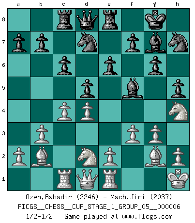 Last move : 1/2-1/2 2024 January 27 1:37:55 [Event "FICGS__CHESS__CUP_STAGE_1_GROUP_05__000006"] [Site "FICGS"] [Date "2023.11.17"] [Round "2"] [White "Ozen,Bahadir"] [Black "Mach,Jiri"] [Result "1/2-1/2"] [WhiteElo "2246"] [BlackElo "2037"] 1.d4 Nf6 2.c4 g6 3.g3 Bg7 4.Bg2 O-O 5.Nf3 c6 6.O-O d5 7.b3 Bf5 8.Bb2 Nbd7 9.Nbd2 h5 10.Nh4 e6 11.f3 Re8 12.Re1 Nh7 13.Kh1 Rc8 14.Rc1 1/2-1/2 Follow this game move after move (download)In order to improve your game, you must study the endgame before everything else, for whereas the endings can be studied and mastered by themselves, the middle game and the opening must be studied in relation to the endgame. (Jose Raul Capablanca) Das Spiel gibt uns die Genugtuung, die das Leben uns versagt. (Emanuel Lasker) Las ideas audaces son como las piezas del Ajedrez que avanzan hacia adelante. Ellas pueden ser vencidas, pero también pueden iniciar una partida victoriosa. (Goethe) Psychologiquement, tu dois avoir confiance en toi même, mais cette confiance doit être basée sur des faits. (Robert Fischer) Thus, what is of supreme importance in war is to attack the enemy's strategy. (Sun Tzu)