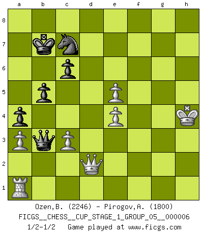 Last move : 1/2-1/2 2024 January 13 8:18:53 [Event "FICGS__CHESS__CUP_STAGE_1_GROUP_05__000006"] [Site "FICGS"] [Date "2023.11.17"] [Round "1"] [White "Ozen,Bahadir"] [Black "Pirogov,Andrey Mikhaylovich"] [Result "1/2-1/2"] [WhiteElo "2246"] [BlackElo "1800"] 1.d4 d5 2.c4 c6 3.Nf3 Nf6 4.e3 Bf5 5.Nc3 e6 6.Nh4 Bg6 7.Nxg6 hxg6 8.Bd2 Nbd7 9.g3 Bb4 10.Qb3 a5 11.Be2 g5 12.a3 dxc4 13.Qxc4 Bxc3 14.Bxc3 Ne4 15.Bf3 Ndf6 16.Qd3 Qd5 17.g4 Rh3 18.Bg2 Rh4 19.Qc2 Rxg4 20.f3 Rxg2 21.Qxg2 Nxc3 22.bxc3 Qc4 23.Rc1 Nd5 24.Qd2 f5 25.h4 gxh4 26.Rg1 O-O-O 27.Rxg7 b5 28.Kf2 Qb3 29.Kg1 Rd7 30.Rxd7 Kxd7 31.e4 fxe4 32.fxe4 Nc7 33.Ra1 Kc8 34.Kh2 Kb7 35.Kh3 a4 36.Kxh4 e5 37.dxe5 1/2-1/2 Follow this game move after move (download)The battle for the ultimate truth will never be won. And that's why Chess is so fascinating. (Hans Kmoch) Bobby Fischer ist kein Vorbild für die heutige Jugend. (Viktor Kortschnoi) El jugador de combinación piensa hacia adelante; comienza de la posición dada y trabaja las movidas contundentes en su mente. (Emanuel Lasker) Il vaut toujours mieux jouer un plan faux de façon logique que de n'avoir pas de plan du tout. (Victor Kortchnoï) When it is a question of money, everybody is of the same religion. (Voltaire)