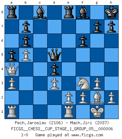 Last move : 1-0 2024 March 10 19:50:43 [Event "FICGS__CHESS__CUP_STAGE_1_GROUP_05__000006"] [Site "FICGS"] [Date "2023.11.17"] [Round "1"] [White "Pech,Jaroslav"] [Black "Mach,Jiri"] [Result "1-0"] [WhiteElo "2106"] [BlackElo "2037"] 1.c4 e5 2.Nc3 Nf6 3.Nf3 Nc6 4.g3 d5 5.cxd5 Nxd5 6.Bg2 Nb6 7.O-O Be7 8.d3 O-O 9.a3 Re8 10.b4 Bf8 11.Bg5 f6 12.Be3 a5 13.b5 Nd4 14.Bxd4 exd4 15.Na4 Kh8 16.Re1 Qd5 17.Nxb6 cxb6 18.Qa4 1-0 This chess game has been lost on time (started : 2023.11.17 20:37:39) Follow this game move after move (download)After black's reply to 1.e4 with 1..e5, leaves him always trying to get into the game. (Howard Staunton) Kann Schach nicht schließlich das Nationalspiel der Deutschen werden? Und welche weiteren Ausblicke bieten sich dann dar! Welche Hebung des allgemeinen Kultur-Niveaus, ja der Moral, wenn das Schachbrett den Kartentisch verdrängen würde! Wahrlich, ein Ziel, des Schweißes der Edlen wert! (Siegbert Tarrasch) Antes de los Finales, los dioses han colocado el Juego Medio. (Siegbert Tarrasch) A chaque perte on perd un peu de soi. (Joël Lautier) Don't be irreplaceable, if you can't be replaced, you can't be promoted. (Dan Rotaru)