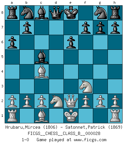 Last move : 1-0 2007 October 26 20:26:28 [Event "FICGS__CHESS__CLASS_B__000028"] [Site "FICGS"] [Date "2007.09.10"] [Round "1"] [White "Hrubaru,Mircea"] [Black "Satonnet,Patrick"] [Result "1-0"] [WhiteElo "1806"] [BlackElo "1869"] 1.e4 e6 2.d4 d5 3.Nd2 c5 4.Ngf3 a6 5.exd5 Qxd5 6.Bc4 Qd8 7.dxc5 Bxc5 8.Qe2 1-0 This chess game has been lost on time (started : 2007.09.10 17:4:30) French : Tarrasch, Open variation Player White won this chess game. Follow this game move after move (download)You can only get good at Chess if you love the game. (Bobby Fischer) Offener Brief an US-Präsident Bush anlässlich der Verhaftung Bobby Fishers: Verhaften Sie mich. Stecken Sie mich in dieselbe Zelle wie Bobby Fisher und geben Sie uns ein Schachspiel mit. (Boris Vassilievich Spassky) Mis oponentes también hacen buenas movidas. A veces yo no tomo esas cosas en consideración. (Bobby Fischer) Vous savez, camarade Pachman, je n'éprouve pas de plaisir à être ministre, je jouerais plutôt aux échecs comme vous, ou alors ferais une révolution au Venezuela. (Che Guevara à Ludek Pachman, 'Checkmate in Prague', 1975) Art is the triumph over chaos. (John Cheever)
