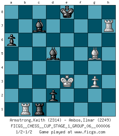Last move : 1/2-1/2 2024 February 3 1:58:16 [Event "FICGS__CHESS__CUP_STAGE_1_GROUP_06__000006"] [Site "FICGS"] [Date "2023.11.17"] [Round "1"] [White "Armstrong,Keith"] [Black "Ambos,Ilmar"] [Result "1/2-1/2"] [WhiteElo "2314"] [BlackElo "2249"] 1.Nf3 Nf6 2.c4 c5 3.Nc3 Nc6 4.g3 d5 5.d4 cxd4 6.Nxd4 e5 7.Nxc6 bxc6 8.Bg2 d4 9.Bxc6+ Bd7 10.Bxa8 Qxa8 11.Nd5 Nxd5 12.cxd5 Qxd5 13.O-O Bd6 14.Qb3 Qc6 15.Re1 O-O 16.Bd2 Rb8 17.Qd3 Qd5 18.e4 Qe6 19.b4 h6 20.a3 Bb5 21.Qf3 Bd7 22.Rac1 Rb6 23.Rc2 Qg6 24.Qg2 Qg4 25.f3 Qe6 26.Ra1 Qb3 27.R2c1 Bb5 28.a4 Bxa4 29.Rc8+ Bf8 30.Qe2 Rf6 31.Rd8 Rc6 32.f4 Qb2 33.Rf1 a6 34.Rf2 exf4 35.Bxf4 Qxb4 36.Qb2 Bb3 37.Bd2 Qb6 38.Ra8 d3 39.Bc3 f6 40.e5 Kf7 41.exf6 g5 42.Bd4 Qb5 43.h4 Bd5 44.Rd8 Bd6 45.hxg5 Qxb2 46.Rxb2 hxg5 47.Rb1 Be6 48.Kf2 Bc7 49.Rh8 Rc2+ 50.Kf3 Kg6 51.f7 Kxf7 52.Rh7+ Ke8 53.Bf6 Bd5+ 54.Ke3 d2 55.Bxg5 Rc1 1/2-1/2 Follow this game move after move (download)My opponents make good moves too. Sometimes I don't take these things into consideration. (Bobby Fischer) Der Bart als Geschlechtszeichen mitten im Gesicht ist obszön. Daher gefällt er den Weibern. [Zugegeben, kein Schachzitat, aber unglaublich originell] (Arthur Schopenhauer) Me dio la sensación de como si yo estuviera jugando en contra del mismo Ajedrez. - al estar jugando en contra de Robert Fischer (Walter Shipman) La vie est comme un jeu d'échecs : nous esquissons un plan, mais celui-ci est tributaire de ce que daignent faire l'adversaire aux échecs et le destin dans la vie. (Arthur Schopenhauer) He who is a good ruler must first have been ruled. (Aristotle)