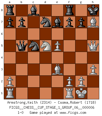 Last move : 1-0 2023 December 11 7:52:54 [Event "FICGS__CHESS__CUP_STAGE_1_GROUP_06__000006"] [Site "FICGS"] [Date "2023.11.17"] [Round "2"] [White "Armstrong,Keith"] [Black "Csoma,Robert"] [Result "1-0"] [WhiteElo "2314"] [BlackElo "1718"] 1.Nf3 d6 2.d4 c6 3.c4 Qc7 4.Nc3 e5 5.e4 Nf6 6.Be3 Be7 7.h3 O-O 8.Bd3 Nbd7 9.O-O exd4 10.Nxd4 Nc5 11.Bc2 d5 12.cxd5 cxd5 13.Ndb5 Qa5 14.e5 Nfd7 15.b4 Qxb4 16.Nxd5 Qxb5 17.Bxh7+ Kh8 18.Qh5 1-0 Follow this game move after move (download)Chess demands total concentration. (Bobby Fischer) Ich kenne Menschen, die allen Willen der Welt besitzen und doch nicht Schach spielen können. (Robert James Fischer) Aún deseo matar a Fischer. (Boris Spassky) Toutes les manuvres exécutées sur une colonne ouverte ont pour but ultime l'intrusion définitive sur la septième ou la huitième rangée, en plein cur de la position ennemie. (Aaron Nimzovitch) Life is like internet, nothing interesting, but noone want to leave it. (Ilmars Cirulis)