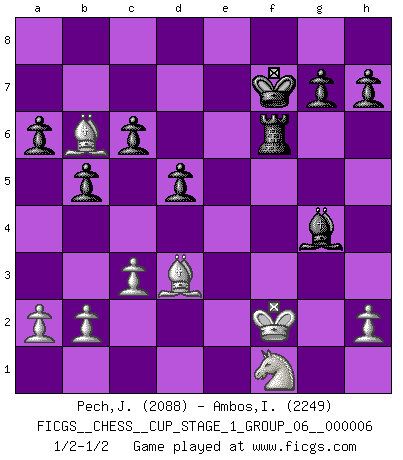 Last move : 1/2-1/2 2024 February 10 4:27:39 [Event "FICGS__CHESS__CUP_STAGE_1_GROUP_06__000006"] [Site "FICGS"] [Date "2023.11.17"] [Round "2"] [White "Pech,Jaroslav senior"] [Black "Ambos,Ilmar"] [Result "1/2-1/2"] [WhiteElo "2088"] [BlackElo "2249"] 1.e4 e5 2.Nf3 Nc6 3.Bb5 a6 4.Ba4 Nf6 5.O-O Nxe4 6.d4 b5 7.Bb3 d5 8.dxe5 Be6 9.c3 Bc5 10.Nbd2 O-O 11.Bc2 Nxf2 12.Rxf2 f6 13.exf6 Bxf2+ 14.Kxf2 Qxf6 15.Nf1 Ne5 16.Be3 Rae8 17.Bc5 Nxf3 18.gxf3 Rf7 19.Ng3 Bg4 20.Kg1 Qxf3 21.Qxf3 Rxf3 22.Rf1 Rxf1+ 23.Kxf1 Re6 24.Bd3 c6 25.Bb6 Rf6+ 26.Ke1 Rh6 27.Nf1 Kf7 28.Kf2 Rf6+ 1/2-1/2 Follow this game move after move (download)Modern Chess is too much concerned with things like Pawn structure. Forget it, Checkmate ends the game. (Nigel Short) Schachspieler können ausgezeichnet Varianten am Schachbrett berechnen, aber nicht im realen Leben. Zu stark ist der Individualismus im Schach ausgeprägt, und für viele ist ein kleiner momentaner persönlicher Vorteil wichtiger als ein weit größerer Vorteil von morgen. (Anatoly Karpov) El Ajedrez era la lengua materna de Capablanca. (Reti) Les Echecs représentent une sphère d'idées créatrices basée sur la volonté des deux protagonistes. (Smyslov) Big Chess is a place for big hallucinations. (Thibault de Vassal)