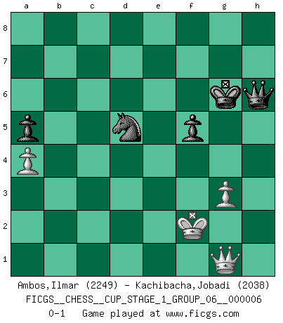 Last move : 0-1 2024 June 22 7:57:26 [Event "FICGS__CHESS__CUP_STAGE_1_GROUP_06__000006"] [Site "FICGS"] [Date "2023.11.17"] [Round "2"] [White "Ambos,Ilmar"] [Black "Kachibacha,Jobadi"] [Result "0-1"] [WhiteElo "2249"] [BlackElo "2038"] 1.d4 d5 2.Nc3 Nf6 3.e4 e6 4.e5 Nfd7 5.Be3 a6 6.f4 c5 7.Nf3 Nc6 8.Qd2 b5 9.h4 Bb7 10.h5 b4 11.Nd1 h6 12.Bd3 Be7 13.Nf2 Rc8 14.c3 bxc3 15.bxc3 cxd4 16.Nxd4 Nc5 17.Bc2 O-O 18.O-O Nxd4 19.Bxd4 Bc6 20.Qe3 Ba4 21.Bb1 Bb5 22.Re1 Qc7 23.Qg3 Rb8 24.Kh2 Bc4 25.Qg4 Rb6 26.Kh1 Rfb8 27.f5 Bg5 28.f6 Rb2 29.fxg7 Bd2 30.Rg1 Na4 31.Qf3 Bg5 32.Nd3 Rd2 33.Nf4 Nc5 34.Nh3 Be2 35.Qg3 Rxb1 36.Nxg5 hxg5 37.Qxg5 Rxd4 38.h6 Rh4+ 39.Qxh4 Rb8 40.Rge1 Qxe5 41.h7+ Kxg7 42.Rxe2 Qxe2 43.Qg3+ Kxh7 44.Qxb8 Ne4 45.Qf4 Kg6 46.Kh2 Qh5+ 47.Kg1 Qe2 48.Rf1 f5 49.a4 a5 50.Rb1 Qc2 51.Rb6 Qd1+ 52.Qf1 Qd2 53.Rxe6+ Kg5 54.Qf3 Qe1+ 55.Kh2 Qh4+ 56.Qh3 Qf4+ 57.g3 Qd2+ 58.Qg2 Qxc3 59.Re8 Nf6 60.Rf8 Kg6 61.Rd8 Qc7 62.Rxd5 Ng4+ 63.Kh1 Qc1+ 64.Qg1 Qh6+ 65.Kg2 Ne3+ 66.Kf2 Nxd5 0-1 This chess game has been lost on time (started : 2023.11.17 20:37:41) Follow this game move after move (download)Chess is not like life... it has rules ! (Mark Pasternak) Wenn Capablanka heute auf der Schachbühne erscheinen würde, hätte er ein halbes Jahr gebraucht um sich die Schachtheorie anzueignen. Und dann hätte er alles und jeden besiegt. (Mikhail Moiseyevich Botvinik) En el Ajedrez, cuando menos, el valiente hereda la tierra. (Edmar Mednis) Psychologiquement, tu dois avoir confiance en toi même, mais cette confiance doit être basée sur des faits. (Robert Fischer) Ah, beer! The cause of, and the solution to, all of life's problems. (Homer Simpson)