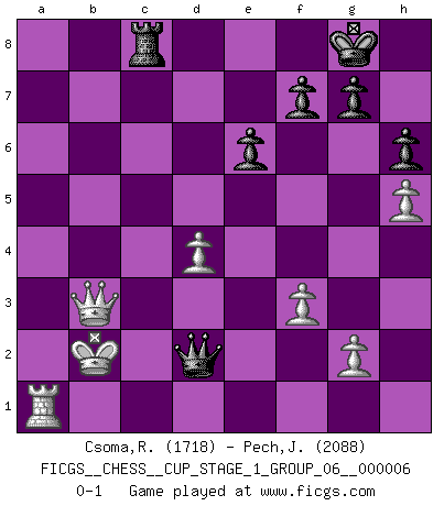 Last move : 0-1 2024 March 12 23:35:2 [Event "FICGS__CHESS__CUP_STAGE_1_GROUP_06__000006"] [Site "FICGS"] [Date "2023.11.17"] [Round "1"] [White "Csoma,Robert"] [Black "Pech,Jaroslav senior"] [Result "0-1"] [WhiteElo "1718"] [BlackElo "2088"] 1.e4 c6 2.d4 d5 3.Nc3 dxe4 4.Nxe4 Bf5 5.Ng3 Bg6 6.Nf3 Nd7 7.Bd3 e6 8.Be3 Ngf6 9.Qe2 Bb4+ 10.c3 Bxd3 11.Qxd3 Bd6 12.O-O-O O-O 13.Ne4 Nxe4 14.Qxe4 Nf6 15.Qc2 Qc7 16.h4 c5 17.Ng5 cxd4 18.cxd4 Qd7 19.Kb1 Rac8 20.Qd3 Rfd8 21.h5 h6 22.Ne4 Be7 23.f3 a5 24.Nc3 Bb4 25.a3 Bxc3 26.bxc3 Qa4 27.Ka2 b5 28.Bd2 Nd5 29.Rb1 b4 30.cxb4 Rc2+ 31.Rb2 Nxb4+ 32.Bxb4 Rxb2+ 33.Kxb2 axb4 34.Ra1 Rc8 35.axb4 Qxb4+ 36.Qb3 Qd2+ 0-1 Follow this game move after move (download)Combinations have always been the most intriguing aspect of Chess. The masters look for them, the public applauds them, the critics praise them. It is because combinations are possible that Chess is more than a lifeless mathematical exercise. They are the poetry of the game; they are to Chess what melody is to music. They represent the triumph of mind over matter. (Reuben Fine) Fischer machte Schach einfach zu einer aufregenden Sache, wann immer er sich ans Brett setzte. (Raymond Keene) Uno no tiene que jugar muy bien, es suficiente jugar mejor que el oponente. (Siegbert Tarrasch) Soyez une menace à chaque fois que vous vous asseyez pour jouer. (Ken Smith) Life is painting a picture, not doing a sum. (Oliver Wendell Holmes, Jr.)