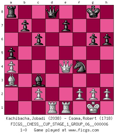 Last move : 1-0 2024 February 3 22:3:5 [Event "FICGS__CHESS__CUP_STAGE_1_GROUP_06__000006"] [Site "FICGS"] [Date "2023.11.17"] [Round "1"] [White "Kachibacha,Jobadi"] [Black "Csoma,Robert"] [Result "1-0"] [WhiteElo "2038"] [BlackElo "1718"] 1.d4 d6 2.e4 Nf6 3.Nc3 g6 4.Nf3 Bg7 5.Be2 c6 6.O-O Bg4 7.a4 a5 8.Ng5 Bxe2 9.Qxe2 h6 10.Nf3 O-O 11.Re1 Na6 12.e5 dxe5 13.dxe5 Nd5 14.e6 Nxc3 15.bxc3 Nc5 16.exf7+ Rxf7 17.Ne5 Rf6 18.Ba3 Ne6 19.Ng4 Nf4 20.Nxf6+ Bxf6 21.Qe4 Bxc3 22.Rad1 1-0 Follow this game move after move (download)When you absolutely don't know what to do anymore, it is time to panic. (John van der Wiel) Auf Remis zu spielen ist gewissermaßen ein Verbrechen gegen das Schachspiel. (Mikhail Nekhemyevich Tal) Muchos se han convertido en Maestros de Ajedrez, nadie se ha convertido en el Maestro del Ajedrez. (Siegbert Tarrasch) C'est une question de caractère, Beaucoup de gens perdent leur motivation très vite. D'autres, ils sont rares, peuvent la conserver très longtemps. J'aime les échecs, encore aujourd'hui je suis heureux d'analyser des parties. J'aime toujours gagner, je déteste encore perdre. Bien jouer est important pour mon intégrité intellectuelle et morale. Et puis les échecs vivent en ce moment une période historique grâce à Internet. Ils se développent dans les systèmes éducatifs à travers le monde. Ils sortent de leur ghetto, et c'est mon rôle de mener à bien cette révolution. (Gary Kasparov) Man with more than one clock never knows what time it is. (Chinese thought)