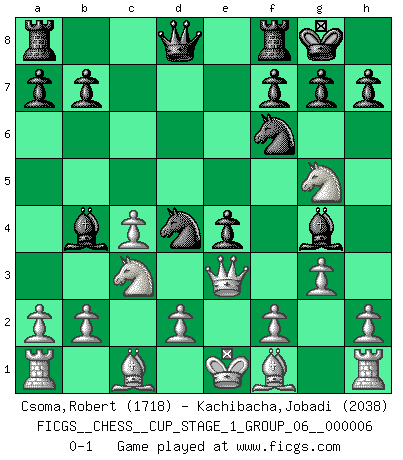 Last move : 0-1 2024 January 2 21:57:2 [Event "FICGS__CHESS__CUP_STAGE_1_GROUP_06__000006"] [Site "FICGS"] [Date "2023.11.17"] [Round "2"] [White "Csoma,Robert"] [Black "Kachibacha,Jobadi"] [Result "0-1"] [WhiteElo "1718"] [BlackElo "2038"] 1.e4 d5 2.exd5 Nf6 3.c4 c6 4.dxc6 Nxc6 5.Nf3 e5 6.Qe2 e4 7.Nc3 Bb4 8.g3 O-O 9.Ng5 Bg4 10.Qe3 Nd4 0-1 Follow this game move after move (download)Play the opening like a book, the middle game like a magician, and the endgame like a machine. (Spielmann) Charakterschwächen offenbaren sich normalerweise während einer Schachpartie. (Garry Kasparov) Las combinaciones han sido siempre el aspecto más intrigante del Ajedrez. Los Maestros las buscan, el público las aplauden, los críticos las alaban. La razón se debe a que las combinaciones hacen posible que el Ajedrez sea más que un ejercicio matemático con una carencia de vida. Ellas son la poesía del juego, son del Ajedrez lo que la melodía es de la música. Ellas representan el triunfo de la mente sobre la materia. (Reuben Fine) Si je n'étais pas joueur d'échecs, je serais le meilleur dans quelque chose d'autre. (Anatoli Karpov) Nowadays, anyone who cannot speak English and is incapable of using the Internet is regarded as backward. (Al-Waleed bin Talal)