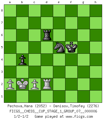 Last move : 1/2-1/2 2024 June 8 17:17:44 [Event "FICGS__CHESS__CUP_STAGE_1_GROUP_07__000006"] [Site "FICGS"] [Date "2023.11.17"] [Round "2"] [White "Pechova,Hana"] [Black "Denisov,Timofey"] [Result "1/2-1/2"] [WhiteElo "2052"] [BlackElo "2276"] 1.e4 e5 2.Nf3 d6 3.d4 exd4 4.Nxd4 Nf6 5.Nc3 Be7 6.Bf4 O-O 7.Qd2 Nc6 8.O-O-O Nxd4 9.Qxd4 Be6 10.f3 a6 11.g4 b5 12.h4 c5 13.Qe3 b4 14.Na4 Qc7 15.g5 Nh5 16.Bh2 Rfe8 17.b3 Bf8 18.Be2 Qc6 19.Qf2 g6 20.Rd2 c4 21.Qb6 Rac8 22.Qxc6 Rxc6 23.bxc4 f5 24.exf5 Bxc4 25.Bxc4+ Rxc4 26.fxg6 Rxh4 27.Rhd1 Be7 28.Re1 Ng7 29.gxh7+ Kxh7 30.f4 Bd8 31.Rxe8 Nxe8 32.Nb2 Bb6 33.Re2 Ng7 34.Nd3 a5 35.Bg3 Rh3 36.Bf2 Bxf2 37.Nxf2 Rh2 38.Rd2 Ne6 39.Nd3 Rh1+ 40.Rd1 Rh4 41.Rf1 Kg7 42.Rf2 Nd4 43.Kb1 Kg6 44.Kb2 Rh3 45.Rd2 Rh4 46.Rg2 Rh1 47.Rd2 Rh4 48.Rf2 Rh3 49.f5+ Kxg5 50.f6 Rh8 51.f7 Rf8 52.Nf4 a4 53.Nd5 Nc6 54.Nb6 Kg6 55.Nxa4 Rxf7 56.Rd2 Rf6 57.Nb6 Kf5 58.Nc4 Ne5 59.Nxd6+ Rxd6 1/2-1/2 Follow this game move after move (download)I love all positions. Give me a difficult positional game, I will play it. But totally won positions, I cannot stand them. (Hein Donner) Es macht mich traurig, wenn ich sehe, dass Golfprofis mehr verdienen als Schachsportler. Obwohl ich davon überzeugt bin, dass wir Schachspieler viel härter trainieren müssen als die Golfer. (Alexandra Kosteniuk) Si un gobernante no entiende al Ajedrez, ¿como puede governar él un reinado?. (El Rey Khusros II) Les échecs c'est le défi de l'alpiniste, toujours plus haut, prêt à tout pour monter à l'assaut du Roi ennemi. Les échecs, c'est de la musique en mouvement, un ballet majestueux pour les yeux. C'est de la poésie composée par les fantômes du passé qui au même titre que Rimbaud ou Verlaine méritent notre admiration. Les échecs, c'est de la peinture ou le moindre mouvement modifie le tableau pour en faire un Picasso ou un Van Gogh. Les échecs, c'est tout et rien, c'est la vie et la mort. Jjulie33 sur le forum de France-Echecs. Vladimir Ras-Putin is still alive... He is also a good actor, I saw him in the Lord of the Rings. (Rodolfo d'Ettorre)