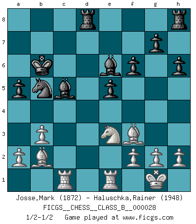 Last move : 1/2-1/2 2008 February 27 18:35:38 [Event "FICGS__CHESS__CLASS_B__000028"] [Site "FICGS"] [Date "2007.09.10"] [Round "1"] [White "Josse,Mark"] [Black "Haluschka,Rainer"] [Result "1/2-1/2"] [WhiteElo "1872"] [BlackElo "1948"] 1.e4 c5 2.Nf3 h6 3.d4 cxd4 4.Nxd4 Nf6 5.Nc3 e5 6.Nf5 d5 7.Bb5+ Nc6 8.exd5 Bxf5 9.dxc6 Qxd1+ 10.Nxd1 O-O-O 11.cxb7+ Kxb7 12.c3 Be6 13.Ne3 Bc5 14.O-O Ne4 15.Be2 Kc7 16.Nd1 Nd2 17.Re1 f6 18.Ne3 a5 19.b3 Ne4 20.Bf3 Nxc3 21.Bb2 Nb5 22.Rac1 Kb6 1/2-1/2 Sicilian defense Queenside Castling by player Black (move 10) Kingside Castling by player White (move 14) This chess game ended in a draw. Follow this game move after move (download)Excellence at Chess is one mark of a scheming mind. (Sir Arthur Conan Doyle) Unter Putin wird alles Geld aus Russland wie von einem Staubsauger nach Moskau umgeleitet, das ist wie ein schwarzes Loch. (Garry Kasparov) Alguna parte de un error es siempre correcto. (Savielly Tartakover) La vie est comme un jeu d'échecs : nous esquissons un plan, mais celui-ci est tributaire de ce que daignent faire l'adversaire aux échecs et le destin dans la vie. (Arthur Schopenhauer) I don't know, I don't care, and it doesn't make any difference. (Albert Einstein)