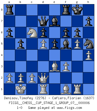 Last move : 1-0 2024 February 21 19:20:19 [Event "FICGS__CHESS__CUP_STAGE_1_GROUP_07__000006"] [Site "FICGS"] [Date "2023.11.17"] [Round "2"] [White "Denisov,Timofey"] [Black "Cafiero,Florian"] [Result "1-0"] [WhiteElo "2276"] [BlackElo "1637"] 1.e4 c5 2.Nf3 d6 3.d4 cxd4 4.Nxd4 Nf6 5.Nc3 a6 6.Be3 e5 7.Nb3 Be7 8.f3 Be6 9.Qd2 Nbd7 10.g4 O-O 11.O-O-O b5 12.g5 Nh5 13.Kb1 Nb6 14.Nd5 Nxd5 15.exd5 Bf5 16.Na5 g6 17.Nc6 Qd7 18.Rg1 f6 19.h4 1-0 This chess game has been lost on time (started : 2023.11.17 20:37:42) Follow this game move after move (download)If your opponent cannot do anything active, then don't rush the position; instead you should let him sit there, suffer, and beg you for a draw. (Jeremy Silman) Aljechin war kein Nazi. Er war ein Opportunist. Ein schrecklicher Mann. Er liebte Geld über alles und würde für Geld ein Jude, ein Katolik oder ein Protestant werden. (Miguel Najdorf) La maestría del Ajedrez consiste esencialmente en analizar posiciónes de Ajedrez con precisión. (Mikhail Botvinnik) Karpov est une pièce de musée. (Garry Kasparov) At last I discovered the true beauty of chess. So I proposed to her. (Dinesh De Silva)