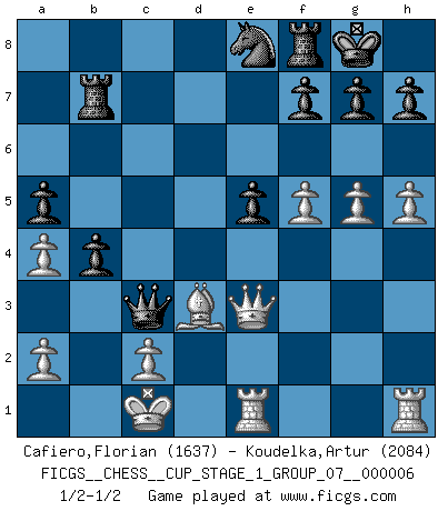 Last move : 1/2-1/2 2024 March 26 17:59:36 [Event "FICGS__CHESS__CUP_STAGE_1_GROUP_07__000006"] [Site "FICGS"] [Date "2023.11.17"] [Round "1"] [White "Cafiero,Florian"] [Black "Koudelka,Artur"] [Result "1/2-1/2"] [WhiteElo "1637"] [BlackElo "2084"] 1.e4 c5 2.Nf3 e6 3.d4 cxd4 4.Nxd4 a6 5.Bd3 Bc5 6.Nb3 Ba7 7.Qe2 Nc6 8.Be3 Nf6 9.Nc3 d6 10.O-O-O b5 11.Bxa7 Rxa7 12.g4 b4 13.Na4 O-O 14.g5 Ne8 15.Qe3 Qc7 16.f4 a5 17.h4 Ne7 18.Nd4 Rb7 19.h5 Bd7 20.b3 e5 21.fxe5 dxe5 22.Nf5 Nxf5 23.exf5 Bxa4 24.bxa4 Qc3 25.Rde1 Qa1+ 26.Kd2 Qc3+ 27.Kc1 Qa1+ 28.Kd2 Qc3+ 29.Kc1 1/2-1/2 Follow this game move after move (download)The only thing Chess players have in common is Chess. (Lodewijk Prins) Ich bewundere Kasparows phantasievolle Angriffssiege aus den Achtzigern und Neunzigern, aber wenn man sie mit dem Computer überprüft, nimmt der Computer in jeder zweiten Partie die Opfer an, verteidigt sich und gewinnt. (Vladimir Kramnik) Un entendimiento a fondo de las continuaciones típicas del mate, hace de las combinaciones de sacrificio mas complicadas conducirlas a ellas no solo sin dificultad, sino casi de una manera natural. (Siegbert Tarrasch) Soyez une menace à chaque fois que vous vous asseyez pour jouer. (Ken Smith) Live, lose, and learn, by observing your opponent how to win. (Amber Steenbock)