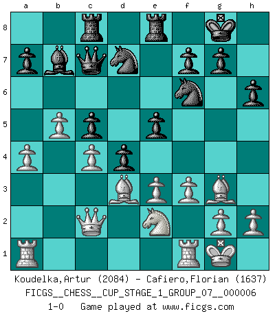 Last move : 1-0 2024 March 1 6:24:23 [Event "FICGS__CHESS__CUP_STAGE_1_GROUP_07__000006"] [Site "FICGS"] [Date "2023.11.17"] [Round "2"] [White "Koudelka,Artur"] [Black "Cafiero,Florian"] [Result "1-0"] [WhiteElo "2084"] [BlackElo "1637"] 1.d4 Nf6 2.c4 e6 3.Nc3 Bb4 4.Qc2 O-O 5.a3 Bxc3+ 6.Qxc3 b6 7.Bg5 Bb7 8.e3 h6 9.Bh4 d6 10.f3 Nbd7 11.Bd3 c5 12.Ne2 Rc8 13.b4 d5 14.dxc5 bxc5 15.b5 Qc7 16.Bg3 e5 17.O-O d4 18.Qc2 Rfe8 19.a4 1-0 This chess game has been lost on time (started : 2023.11.17 20:37:42) Follow this game move after move (download)A man that will take back a move at Chess will pick a pocket. (Richard Fenton) Als ich elf wurde, wurde ich einfach gut. (Robert James Fischer) El Ajedrez demanda una total concentración. (Bobby Fischer) Les échecs sont un jeu terrible. Si vous n'avez pas le centre, votre adversaire a une position plus libre. Par contre, si vous avez le centre, alors vous avez vraiment quelque chose pour laquelle vous inquiéter ! (Siegbert Tarrasch) Every vice is only an exaggeration of a necessary and virtuous function. (Ralph Waldo Emerson, Journals 1936)