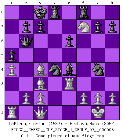 Last move : 0-1 2024 February 23 10:38:0 [Event "FICGS__CHESS__CUP_STAGE_1_GROUP_07__000006"] [Site "FICGS"] [Date "2023.11.17"] [Round "2"] [White "Cafiero,Florian"] [Black "Pechova,Hana"] [Result "0-1"] [WhiteElo "1637"] [BlackElo "2052"] 1.e4 d5 2.exd5 Qxd5 3.Nc3 Qa5 4.d4 Nf6 5.Nf3 Bf5 6.Bc4 e6 7.Bd2 Bb4 8.O-O Nc6 9.a3 Bxc3 10.Bxc3 Qb6 11.Re1 O-O-O 12.a4 a5 13.Qc1 Be4 14.Ne5 Nxd4 15.Nxf7 Ng4 16.Re3 Rhf8 0-1 This chess game has been lost on time (started : 2023.11.17 20:37:42) Follow this game move after move (download)Chess is a beautiful mistress. (Bent Larsen) Woher wissen wir, daß der Neanderthaler Blindschach gespielt hat? -- Bei Ausgrabungen wurden keine Schachbretter und Figuren gefunden. (Anonymous) No es una movida, aún la mejor movida que tu debas buscar, sino un plan comprensible. (Eugene Znosko-Borovsky) Si je n'étais pas joueur d'échecs, je serais le meilleur dans quelque chose d'autre. (Anatoli Karpov) Internet: Absolute communication, absolute isolation. (Paul Carvel)