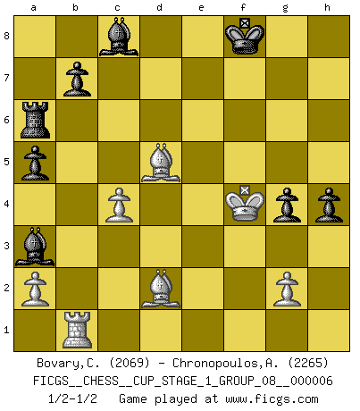 Last move : 1/2-1/2 2023 December 14 18:31:21 [Event "FICGS__CHESS__CUP_STAGE_1_GROUP_08__000006"] [Site "FICGS"] [Date "2023.11.17"] [Round "1"] [White "Bovary,Charles"] [Black "Chronopoulos,Antonis"] [Result "1/2-1/2"] [WhiteElo "2069"] [BlackElo "2265"] 1.e4 e5 2.Nf3 Nc6 3.Nc3 Nf6 4.d4 exd4 5.Nd5 Nb4 6.Bc4 Nbxd5 7.exd5 Bb4+ 8.Kf1 Bc5 9.Qe1+ Be7 10.d6 cxd6 11.Nxd4 O-O 12.Nf5 Re8 13.Qe3 d5 14.Qg5 g6 15.Nh6+ Kg7 16.Nf5+ Kg8 17.Nh6+ Kg7 18.Nf5+ Kh8 19.Nh6 Qc7 20.Bxd5 Qc5 21.Bxf7 Rf8 22.h4 Ne4 23.Qxc5 Bxc5 24.Rh3 Bxf2 25.Rf3 Bxh4 26.Bc4 Ng3+ 27.Kf2 Kg7 28.Rxf8 Kxf8 29.Kf3 g5 30.Bd2 d5 31.Bxd5 a5 32.Ng4 h5 33.Nf6 g4+ 34.Kf4 Bxf6 35.Kxg3 h4+ 36.Kf4 Ra6 37.c4 Bxb2 38.Rb1 Ba3 1/2-1/2 Follow this game move after move (download)Chess holds its master in its own bonds, shackling the mind and brain so that the inner freedom of the very strongest must suffer. (Albert Einstein) Die unerbitterlichsten Regeln im Schach sind die Ausnahmen. (Savielly Grigorievitsch Tartakower) Si tu oponente no puede hacer nada activo, entonces no apures la posición; En vez de eso, dejalo estar sentado ahí, sufriendo y rogandote por un empate. (Jeremy Silman) Tout change constamment, y compris dans le monde des Echecs. (Botvinnik) You have to believe in yourself. (Sun Tzu)
