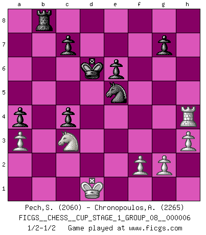 Last move : 1/2-1/2 2024 February 16 17:8:43 [Event "FICGS__CHESS__CUP_STAGE_1_GROUP_08__000006"] [Site "FICGS"] [Date "2023.11.17"] [Round "2"] [White "Pech,Stepan"] [Black "Chronopoulos,Antonis"] [Result "1/2-1/2"] [WhiteElo "2060"] [BlackElo "2265"] 1.e4 e5 2.Nf3 Nc6 3.Bb5 Nf6 4.O-O Nxe4 5.d4 Nd6 6.Bxc6 dxc6 7.dxe5 Nf5 8.Qxd8+ Kxd8 9.Nc3 Be7 10.h3 h5 11.Bf4 Be6 12.Rad1+ Kc8 13.a3 b5 14.Rfe1 Kb7 15.Ng5 Bc4 16.b3 Be6 17.Nxe6 fxe6 18.Bc1 a5 19.Kf1 h4 20.Ne4 a4 21.b4 c5 22.bxc5 Rhd8 23.Bg5 Rxd1 24.Rxd1 Kc6 25.Bxe7 Nxe7 26.Ng5 Re8 27.Ke2 Ng6 28.c4 bxc4 29.Rd4 Nxe5 30.Rxh4 Kxc5 31.Kd1 Kd5 32.Ne4 Rb8 33.Nc3+ Kd6 1/2-1/2 Follow this game move after move (download)The older I grow, the more I value pawns. (Paul Keres) Alle offensichtlichen Züge sehen nach dem Spiel in der Analyse verdächtig aus. (Viktor Kortschnoi) Algunos sacrificios son sólidos, los demás son míos. (Mikhail Tal) Les échecs c'est le défi de l'alpiniste, toujours plus haut, prêt à tout pour monter à l'assaut du Roi ennemi. Les échecs, c'est de la musique en mouvement, un ballet majestueux pour les yeux. C'est de la poésie composée par les fantômes du passé qui au même titre que Rimbaud ou Verlaine méritent notre admiration. Les échecs, c'est de la peinture ou le moindre mouvement modifie le tableau pour en faire un Picasso ou un Van Gogh. Les échecs, c'est tout et rien, c'est la vie et la mort. Jjulie33 sur le forum de France-Echecs. The problem with troubleshooting is that trouble shoots back. (Anonymous)