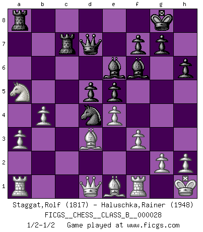 Last move : 1/2-1/2 2008 April 13 15:5:29 [Event "FICGS__CHESS__CLASS_B__000028"] [Site "FICGS"] [Date "2007.09.10"] [Round "1"] [White "Staggat,Rolf"] [Black "Haluschka,Rainer"] [Result "1/2-1/2"] [WhiteElo "1817"] [BlackElo "1948"] 1.e4 c5 2.Nf3 h6 3.d4 cxd4 4.Nxd4 e5 5.Nb5 d6 6.Bc4 Nf6 7.O-O Be7 8.Be3 Nc6 9.Nd2 O-O 10.a3 Bd7 11.f3 a6 12.Nc3 Rc8 13.Nd5 b5 14.Bb6 Qe8 15.Bd3 Be6 16.c4 bxc4 17.Nxf6+ Bxf6 18.Nxc4 Qd7 19.Bf2 Rb8 20.b4 Nd4 21.Na5 Rfc8 22.Bxa6 Rc3 23.Kh1 Ra8 24.Bd3 d5 25.Be1 Rc7 1/2-1/2 Sicilian defense Kingside Castling by player White (move 7) Kingside Castling by player Black (move 9) This chess game ended in a draw. Follow this game move after move (download)The passed Pawn is a criminal, who should be kept under lock and key. Mild measures, such as police surveillance, are not sufficient. (Aaron Nimzovich) Rubinstein ist ein Turmendspiel, welches die Götter vor tausenden von Jahren begannen. (Savielly Grigorievitsch Tartakower) Sin errores no puede haber brillantez. (Emanuel Lasker) Le jeu d'échecs est comme rejeté hors du temps. (Antoine de Saint-Exupéry) Creativity is allowing yourself to make mistakes. Art is knowing which ones to keep. (Scott Adams)