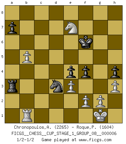 Last move : 1/2-1/2 2024 February 5 21:9:13 [Event "FICGS__CHESS__CUP_STAGE_1_GROUP_08__000006"] [Site "FICGS"] [Date "2023.11.17"] [Round "2"] [White "Chronopoulos,Antonis"] [Black "Roque,Pedro"] [Result "1/2-1/2"] [WhiteElo "2265"] [BlackElo "1604"] 1.d4 d5 2.c4 e6 3.Nc3 Nf6 4.cxd5 exd5 5.Bg5 Be7 6.e3 h6 7.Bh4 c6 8.Bd3 Ne4 9.Bxe7 Qxe7 10.Bxe4 dxe4 11.Nge2 O-O 12.Qc2 f5 13.Nf4 Re8 14.O-O Nd7 15.Rfd1 g5 16.Nfe2 Qf7 17.d5 Ne5 18.a3 Kh7 19.b4 Rf8 20.h3 Bd7 21.dxc6 bxc6 22.Rd6 Rae8 23.Ng3 Be6 24.Nce2 h5 25.Nd4 h4 26.Nxe6 Rxe6 27.Rxe6 Qxe6 28.Ne2 Rg8 29.Qc5 Rg7 30.Qf8 Rf7 31.Qd8 Rd7 32.Nd4 Rxd8 33.Nxe6 Rd2 34.Nxg5+ Kg6 35.Ne6 Nd3 36.Rf1 Ra2 37.Nd4 f4 38.Nxc6 Rxa3 39.b5 Kf5 40.Nd4+ Ke5 41.Nc6+ Kf5 42.Rb1 Kg5 43.Ne7 Kf6 1/2-1/2 Follow this game move after move (download)Place the contents of the Chess box in a hat, shake them up vigorously, pour them on the board from a height of two feet, and you get the style of Steinitz. (H. E. Bird) Nicht daß Diemer aus Opportunismus Mitglied der NSDAP geworden wäre. Er war ein Fanatiker, in allem, was er tat. (Hans Ree) No hay precio que no valga la pena por la cabellera del Rey enemigo. (Koblentz) La tactique, c'est ce que vous faites quand il y a quelque chose à faire; la stratégie, c'est ce que vous faites quand il n'y a rien à faire. (Savielli Tartacower) Horse racing is animated roulette. (Roger Kahn)