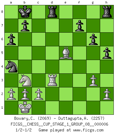 Last move : 1/2-1/2 2024 January 2 18:46:36 [Event "FICGS__CHESS__CUP_STAGE_1_GROUP_08__000006"] [Site "FICGS"] [Date "2023.11.17"] [Round "2"] [White "Bovary,Charles"] [Black "Duttagupta,Aniruddha"] [Result "1/2-1/2"] [WhiteElo "2069"] [BlackElo "2257"] 1.e4 c5 2.Nf3 d6 3.d4 cxd4 4.Nxd4 Nf6 5.Nc3 a6 6.f3 e5 7.Nb3 Be6 8.Be3 h5 9.Qd2 Nbd7 10.Nd5 Bxd5 11.exd5 g6 12.O-O-O Nb6 13.Kb1 Nbxd5 14.Bg5 Be7 15.Bd3 Qc7 16.Rhe1 Nb6 17.f4 O-O-O 18.fxe5 dxe5 19.Qe2 Nfd5 20.Bd2 Kb8 21.g3 Nb4 22.Qxe5 Qxe5 23.Rxe5 Bd6 24.Bc3 Nxd3 25.Rxd3 Na4 26.Bd4 Bxe5 27.Bxe5+ 1/2-1/2 Follow this game move after move (download)In order to improve your game, you must study the endgame before everything else, for whereas the endings can be studied and mastered by themselves, the middle game and the opening must be studied in relation to the endgame. (Jose Raul Capablanca) Sicherlich können nur Meister einen Stil haben. Daß ein nicht-Meister auch nur ein einziges Mal in seinem Leben eine Partie folgerecht durchführte, habe ich niemals bemerkt. (Emanuel Lasker) Los problemas de Ajedrez exigen del compositor las mismas virtudes que caracterizan todo el arte de valor: originalidad, invención, concisión, armonía, complejidad e insinceridad explendida. (Vladimir Nabokov) Il (Jacob Murray) ne joue pas pour le bon coup, mais pour le meilleur. (Eloi Relange) To be champion requires more than simply being a strong player; one has to be a strong human being as well. (Anatoly Karpov)