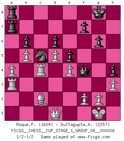 Last move : 1/2-1/2 2024 April 2 7:42:38 [Event "FICGS__CHESS__CUP_STAGE_1_GROUP_08__000006"] [Site "FICGS"] [Date "2023.11.17"] [Round "2"] [White "Roque,Pedro"] [Black "Duttagupta,Aniruddha"] [Result "1/2-1/2"] [WhiteElo "1604"] [BlackElo "2257"] 1.e4 g6 2.d4 Bg7 3.Nf3 d6 4.c3 Nf6 5.Bd3 O-O 6.O-O Nbd7 7.Re1 e5 8.h3 Re8 9.d5 Rf8 10.a4 a5 11.Bc2 Kh8 12.Na3 Ng8 13.Nb5 Bh6 14.Bxh6 Nxh6 15.Qd2 Kg7 16.b4 Nb6 17.Bb3 Ng8 18.Qe3 Bd7 19.bxa5 Rxa5 20.c4 Bxb5 21.cxb5 Qe7 22.Ra2 Nf6 23.Rc1 Rfa8 24.Nd2 Nfd7 25.Rxc7 Qd8 26.R7c2 Nc5 27.Nc4 Nxc4 28.Rxc4 Qh4 29.Qc3 b6 30.Ra1 h5 31.Bd1 Qg5 32.Bc2 h4 33.Qb4 Rc8 34.Qe1 Ra7 35.Ra2 Qh6 36.Ra1 Qg5 37.Qd1 Rca8 38.Ra3 Rc7 39.Bd3 Rca7 40.Bc2 Kg8 41.Ra1 Ra5 42.Rb1 Kh7 43.R1b4 Qf4 44.Rc3 R5a7 45.Ra3 Kg8 46.Rc4 1/2-1/2 Follow this game move after move (download)Man is a frivolous, a specious creature, and like a Chess player, cares more for the process of attaining his goal than for the goal itself. (Dostoyevsky) Es macht mich traurig, wenn ich sehe, dass Golfprofis mehr verdienen als Schachsportler. Obwohl ich davon überzeugt bin, dass wir Schachspieler viel härter trainieren müssen als die Golfer. (Alexandra Kosteniuk) El Ajedrez es un regaderazo frío para la mente. (Sir John Simon) On a dit que l'homme se distingue de l'animal par le fait qu'il achète plus de livres qu'il ne peut en lire. Je voudrais suggérer qu'inclure à la liste des livres quelques livres d'échecs rendrait la distinction manifeste. (Edward Lasker) Follow your passion, and success will follow you. (Arthur Buddhold)