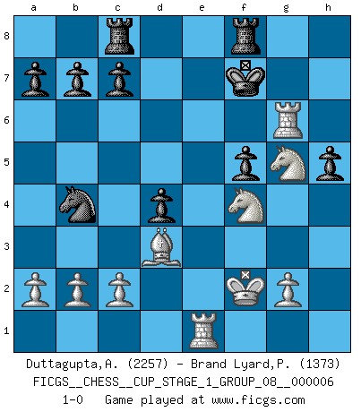 Last move : 1-0 2023 December 10 9:51:7 [Event "FICGS__CHESS__CUP_STAGE_1_GROUP_08__000006"] [Site "FICGS"] [Date "2023.11.17"] [Round "2"] [White "Duttagupta,Aniruddha"] [Black "Brand Lyard,Paul"] [Result "1-0"] [WhiteElo "2257"] [BlackElo "1373"] 1.e4 e5 2.f4 exf4 3.Nf3 Be7 4.Bc4 Nf6 5.e5 Ng4 6.d4 Bh4+ 7.Kf1 Ne3+ 8.Bxe3 fxe3 9.Qd3 O-O 10.Nc3 e2+ 11.Kxe2 Nc6 12.Qe4 d6 13.Bd3 g6 14.Qxh4 Qxh4 15.Nxh4 Bg4+ 16.Kf2 dxe5 17.h3 exd4 18.Nd5 Bxh3 19.Rxh3 Rac8 20.Nf3 f5 21.Rah1 h5 22.Rg3 Kg7 23.Nf4 Kf6 24.Re1 Nb4 25.Rxg6+ Kf7 26.Ng5+ 1-0 Follow this game move after move (download)The most powerful weapon in Chess is to have the next move. (David Bronstein) Privat ist Kortschnoi kein schlechter Mensch, sehr sympathisch. Aber während des Spiels ist er grausam. Er will dich töten. (Miguel Najdorf) Si tu oponente no puede hacer nada activo, entonces no apures la posición; En vez de eso, dejalo estar sentado ahí, sufriendo y rogandote por un empate. (Jeremy Silman) Les échecs sont un jeu terrible. Si vous n'avez pas le centre, votre adversaire a une position plus libre. Par contre, si vous avez le centre, alors vous avez vraiment quelque chose pour laquelle vous inquiéter ! (Siegbert Tarrasch) If we don't succeed, we run the risk of failure. (George W. Bush)