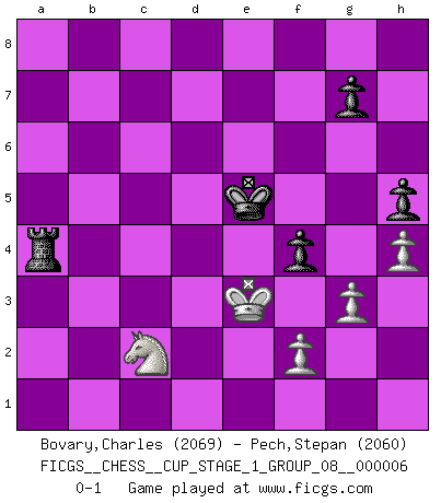 Last move : 0-1 2024 May 16 15:13:14 [Event "FICGS__CHESS__CUP_STAGE_1_GROUP_08__000006"] [Site "FICGS"] [Date "2023.11.17"] [Round "1"] [White "Bovary,Charles"] [Black "Pech,Stepan"] [Result "0-1"] [WhiteElo "2069"] [BlackElo "2060"] 1.e4 e5 2.Nf3 Nc6 3.Nc3 Nf6 4.d4 exd4 5.Nd5 Be7 6.Bd3 O-O 7.h4 Re8 8.Kf1 d6 9.Bg5 h6 10.Bxf6 Bxf6 11.Qd2 a5 12.g3 Nb4 13.Kg2 Be6 14.Bc4 Bd7 15.Rhe1 c5 16.Nxf6+ Qxf6 17.c3 b5 18.Be2 d3 19.Bxd3 Nxd3 20.Qxd3 Bc6 21.Re3 Rad8 22.Kg1 d5 23.e5 Qe6 24.Qe2 d4 25.cxd4 cxd4 26.Rd3 b4 27.Nxd4 Qd5 28.Nxc6 Qxd3 29.Qxd3 Rxd3 30.Nxa5 Rxe5 31.Nc6 Re4 32.a4 bxa3 33.bxa3 Re6 34.Rc1 Rd2 35.Na7 Red6 36.Kg2 Ra2 37.Nb5 R6d2 38.Rf1 Kh7 39.Nc3 Rac2 40.Nd1 Rd3 41.Kg1 Rc1 42.Ne3 Rxf1+ 43.Kxf1 Kg6 44.Nc2 Kf6 45.a4 Rd2 46.Ne3 Rd4 47.a5 Ra4 48.Kg2 Rxa5 49.Kf3 Ra4 50.Kg2 Ke5 51.Kf3 f5 52.Nc2 h5 53.Ke3 f4+ 0-1 Follow this game move after move (download)Without error there can be no brilliancy. (Emanuel Lasker) Der Verteidiger gebe der Gewalt nach, aber nur der Gewalt. Er schaffe sich nicht freiwillig, etwa aus Blindheit oder aus Schrecken, irgendwelche Schwächen. Er lasse sich nicht bluffen. (Emanuel Lasker) El juego del Ajedrez no es solamente una diversión quieta; algunas cualidades muy valuables de la mente se pueden adquirir y cultivar con el, como convertirlos en habitos disponibles para toda ocasión; ya que la vida es algo así como el Ajedrez. (Benjamin Franklin) Il n'y a pas eu de défaite parce que je ne crois pas que cet ordinateur ait jamais existé. IBM a triché en refusant d'imprimer les modes de recherche de la machine. C'est évident, pendant le match, des coups décisifs ont été joués par des êtres humains. Aujourd'hui, les meilleurs spécialistes en informatique ne peuvent toujours pas expliquer comment Deep-Blue a pu jouer contre la logique des ordinateurs. IBM a gagné une guerre de communication, mais ils sont incapables de prouver que l'ordinateur a gagné tout seul. (Garry Kasparov) When the going gets tactical, the computers get going. (Hyatt)