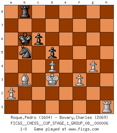 Last move : 1-0 2024 May 16 15:23:0 [Event "FICGS__CHESS__CUP_STAGE_1_GROUP_08__000006"] [Site "FICGS"] [Date "2023.11.17"] [Round "1"] [White "Roque,Pedro"] [Black "Bovary,Charles"] [Result "1-0"] [WhiteElo "1604"] [BlackElo "2069"] 1.e4 e5 2.Nf3 Nc6 3.Bb5 a6 4.Ba4 Nf6 5.O-O Nxe4 6.d4 b5 7.Bb3 d5 8.dxe5 Be6 9.Nbd2 Bc5 10.Qe2 Nxd2 11.Bxd2 O-O 12.c3 Qd7 13.Be3 Bxe3 14.Qxe3 Rae8 15.h3 f6 16.exf6 Rxf6 17.Rfe1 Bf7 18.Qd3 Rd8 19.Re3 Na5 20.Ne5 Qd6 21.Bc2 Bg6 22.Nxg6 hxg6 23.b4 Nc4 24.Re2 Qf4 25.Rae1 c6 26.Qd4 Qxd4 27.cxd4 Rdf8 28.f3 g5 29.Kh2 Na3 30.Bd3 Nc4 31.Bc2 a5 32.bxa5 Nxa5 33.Re5 Nc4 34.Rxg5 Kf7 35.h4 g6 36.Kg3 Ra8 37.Bb3 b4 38.h5 gxh5 39.Rxh5 Rg8+ 40.Kh2 Kg6 41.Rh4 Rg7 42.Rh8 Kf7 43.Ba4 Rg8 44.Rxg8 Kxg8 45.Rb1 Kf7 46.Kg3 Ke7 47.Rxb4 Kd6 48.Rb7 Rg6+ 49.Kf2 Rg8 50.Rh7 Ra8 51.Rh6+ Kc7 52.Bb3 Nd6 53.Rh7+ Kb6 54.Rh1 Nb5 55.Ke3 Re8+ 56.Kd3 Rb8 57.g4 1-0 Follow this game move after move (download)Fischer Chess play was always razor-sharp, rational and brilliant. One of the best ever. (Dave Regis) Ich las kürzlich ein Buch von Nietzsche. Er sagte Religion verdumme nur die Menschen. Ich stimme zu. (Robert James Fischer) Cuando le juegas a Fischer, no es una cuestion de si vas a ganar o perder. Es una cuestion de si vas a sobrevivir. (Boris Spassky) Les échecs sont utiles à l'exercice de la faculté de penser et à celle de l'imagination. Car nous devons posséder une méthode élaborée pour atteindre des buts partout où nous devons conduire notre raison. (Leibnitz) It is not true that people stop pursuing dreams because they grow old, they grow old because they stop pursuing dreams. (Gabriel Garcia Marquez)