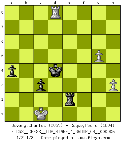 Last move : 1/2-1/2 2024 May 1 22:37:59 [Event "FICGS__CHESS__CUP_STAGE_1_GROUP_08__000006"] [Site "FICGS"] [Date "2023.11.17"] [Round "2"] [White "Bovary,Charles"] [Black "Roque,Pedro"] [Result "1/2-1/2"] [WhiteElo "2069"] [BlackElo "1604"] 1.e4 e5 2.Nf3 Nc6 3.Bc4 Bc5 4.b4 Bxb4 5.c3 Ba5 6.d4 d6 7.Qb3 Qd7 8.dxe5 Bb6 9.Nbd2 dxe5 10.a4 Bc5 11.Bd5 Nf6 12.Bxc6 bxc6 13.Nxe5 Qe7 14.Nd3 Nxe4 15.O-O Nxd2 16.Bxd2 Bd6 17.c4 Qh4 18.g3 Qd4 19.Rfe1+ Be6 20.Nf4 Qxd2 21.Nxe6 fxe6 22.c5 Qd5 23.Qb7 O-O 24.cxd6 cxd6 25.Rad1 Qc5 26.Rf1 Rac8 27.Qe7 Rfe8 28.Qxd6 Qxd6 29.Rxd6 Kf7 30.Rfd1 c5 31.R1d3 Re7 32.Rf3+ Kg6 33.h3 h6 34.Kf1 c4 35.Rc3 Kf5 36.Rd4 Rec7 37.Ke2 e5 38.Rd6 Rb7 39.Rf3+ Kg5 40.Re6 Rc5 41.Kd2 Rb3 42.Rf7 c3+ 43.Kc2 Ra3 44.f4+ exf4 45.Rxg7+ Kf5 46.Rxh6 Ke4 47.Rh4 Ra2+ 48.Kc1 Rd5 49.Rxf4+ Kd3 50.Rb7 a5 51.g4 Ra1+ 52.Rb1 Ra3 53.Rb7 Ra1+ 54.Rb1 Ra2 55.Rb7 Rd6 56.g5 Ra1+ 57.Rb1 Ra2 58.Rb3 Ra1+ 59.Rb1 Rxa4 60.Rxa4 Re6 61.Rd4+ Kxd4 62.Rb8 Re1+ 63.Kc2 Re2+ 64.Kc1 a4 65.Rd8+ 1/2-1/2 Follow this game move after move (download)I am the best player in the world and I am here to prove it. (Bobby Fischer) Das ganze Leben mit einer Ehefrau ist wie ein Endspiel mit ungleichfarbigen Läufern. (Viktor Kortschnoi) El Jaque al descubierto es el bombardero del tablero. (Reuben Fine) Une platitude souvent récitée à propos des Echecs est qu'une des choses les plus difficiles à réaliser est de gagner une position gagnante. Cela ne manque pas de sens mais, pour ma part, j'ai toujours trouvé plus difficile de gagner une position perdante. (Tim Krabbe) Fear is the path to the dark side. Fear leads to anger; anger leads to hate; hate leads to suffering. I sense much fear in you. (Master Yoda in Star Wars ep.1)