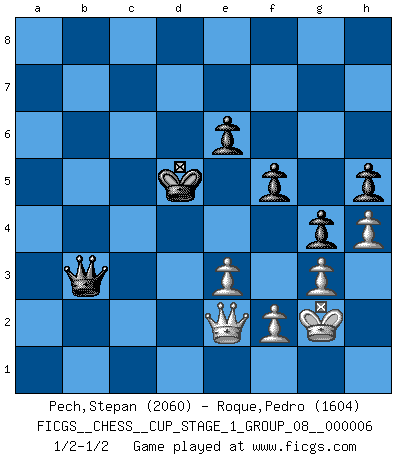 Last move : 1/2-1/2 2024 June 29 13:47:19 [Event "FICGS__CHESS__CUP_STAGE_1_GROUP_08__000006"] [Site "FICGS"] [Date "2023.11.17"] [Round "1"] [White "Pech,Stepan"] [Black "Roque,Pedro"] [Result "1/2-1/2"] [WhiteElo "2060"] [BlackElo "1604"] 1.d4 Nf6 2.c4 e6 3.Nf3 d5 4.Nc3 Bb4 5.Bg5 h6 6.Bxf6 Qxf6 7.e3 O-O 8.Rc1 dxc4 9.Bxc4 c5 10.O-O cxd4 11.Nxd4 Bd7 12.Qb3 Nc6 13.Nxc6 Bxc3 14.Rxc3 Bxc6 15.Bb5 Bd5 16.Bc4 Bc6 17.Bb5 Be4 18.Bd3 Bxd3 19.Rxd3 b6 20.Qc3 Qf5 21.Rd7 Rfd8 22.Rxd8+ Rxd8 23.Qc7 Rd2 24.Qxa7 Rxb2 25.a4 Qc5 26.Qa8+ Kh7 27.Qe4+ g6 28.Qf3 Qc7 29.g3 Rb4 30.Ra1 Kg7 31.Qd1 Qc6 32.a5 bxa5 33.Rxa5 Qe4 34.Ra1 Rc4 35.Rc1 Rxc1 36.Qxc1 g5 37.h3 Qf5 38.Qa1+ Kg6 39.Kg2 Qe4+ 40.Kh2 Qc2 41.Qg1 h5 42.Qg2 g4 43.h4 Kf5 44.Qf1 Qb3 45.Kg1 Ke4 46.Kg2 Kf5 47.Kg1 Ke4 48.Kg2 f5 49.Qe2 Ke5 50.Kh2 Ke4 51.Kg2 Kd5 1/2-1/2 Follow this game move after move (download)Different people feel differently about resigning. (Bobby Fischer) Als er Schachweltmeister wurde ließ er praktisch alle stärksten Sovietspieler für sich arbeiten. Wenn ein auch nur mittelmässiger Meister ein Spezialist für eine bestimmte Eröffnung war, wurde er von Karpov gerufen. Das wurde alles geheim gehalten. (Mikhail Moiseyevich Botvinik) Cuando tu casa esta en llamas, no puedes ser molestado por tus vecinos. O, como decinos en Ajedrez, si tu Rey esta bajo ataque, no te preocupa perder un Peón del lado de la Reina. (Gary Kasparov) La solitude du joueur d'Echecs à l'approche du mat est semblable à celle du condamné. (Francis Szpiner) I live to kill Traxler counterattack. (Ilmars Cirulis)
